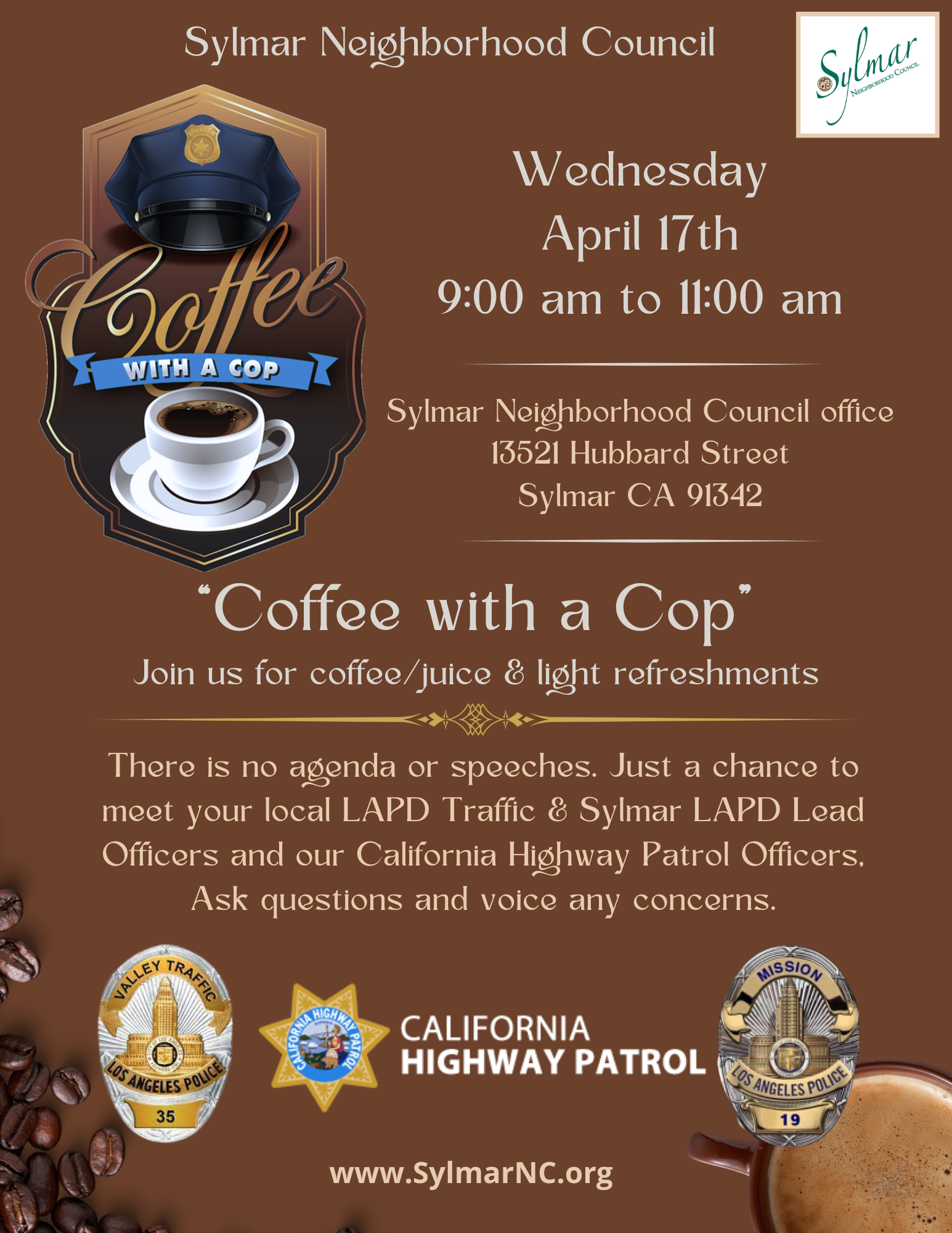 Join us at the Sylmar Neighborhood Council Office for "Coffee with a Cop" an event that brings community members and police officers together over coffee for community discussions.