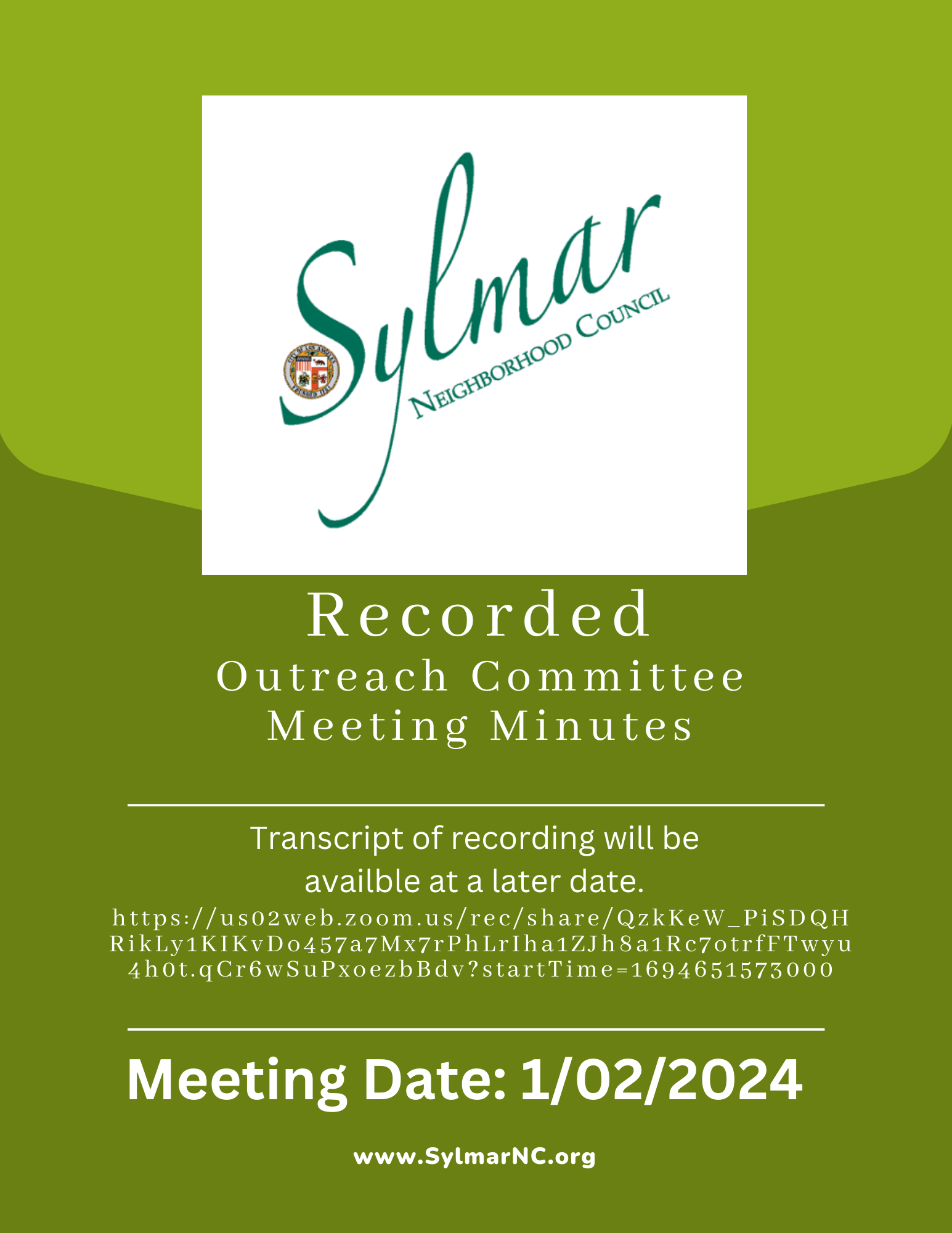 The Outreach Committee's regularly scheduled meeting is on the 1st Tuesday of the month from 6:30 pm to 8:00 pm.