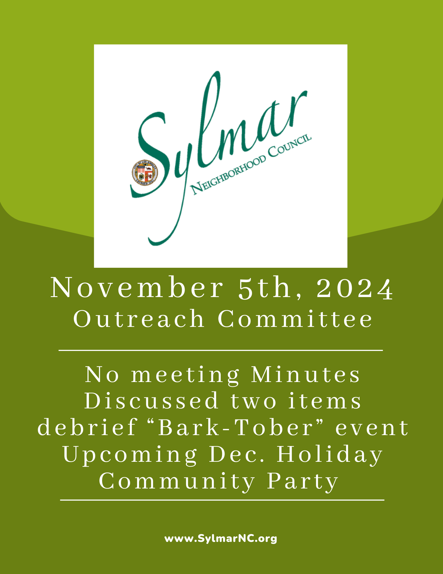 The Outreach Committee is responsible for ongoing outreach efforts for the Council and its Committees, outreach projects, and the methods for generally improving communication and outreach to existing as well as new residents and businesses.