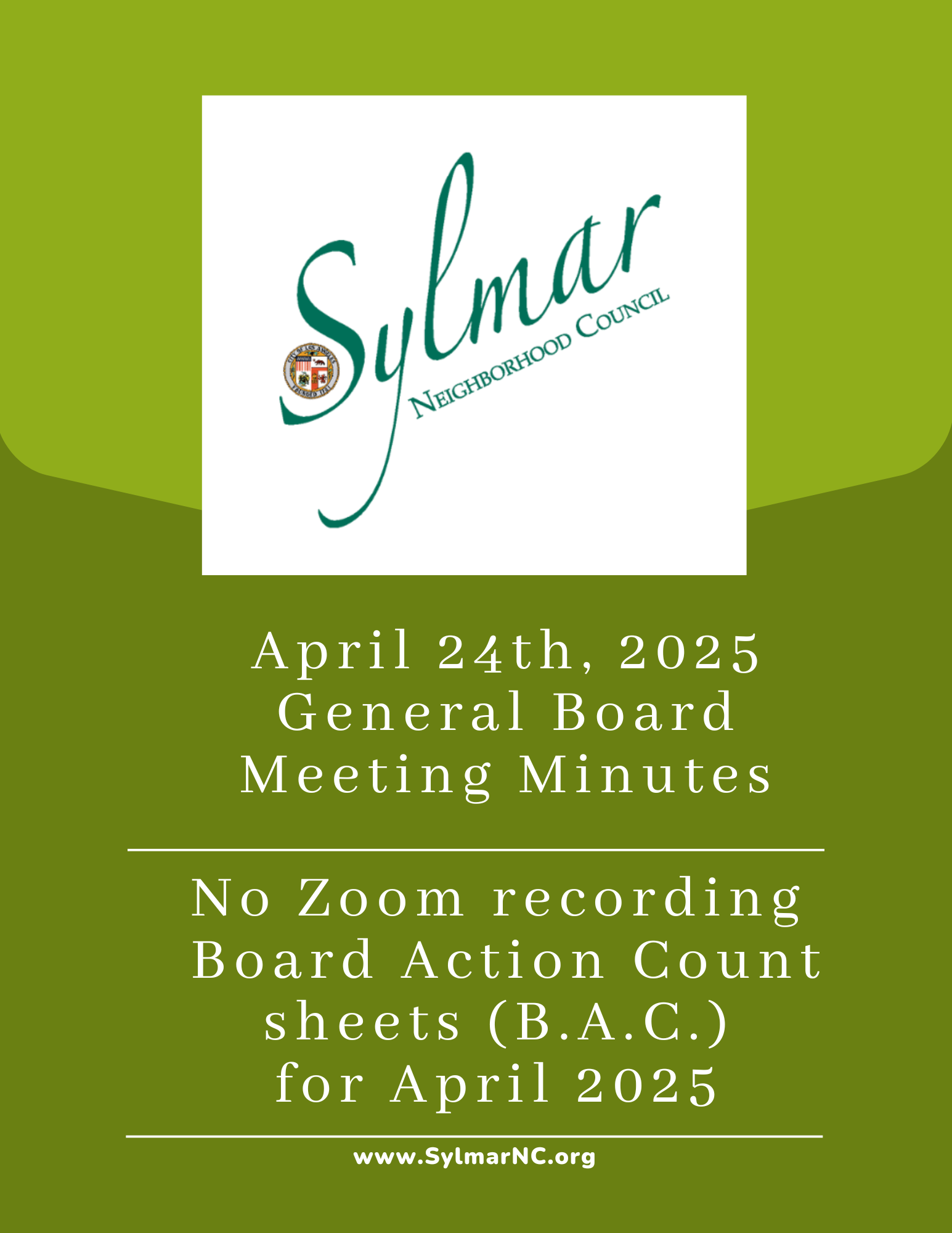 The Sylmar Neighborhood Council's regularly scheduled full board meeting is held on the 4th Thursday of the month at 6:30 pm.