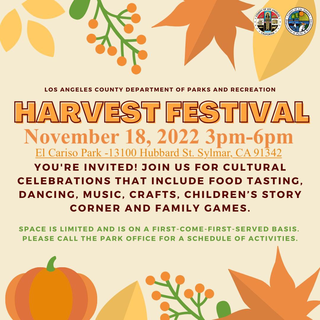 Harvest Festival - November 18th, 2022, from 3:00 pm to 6:00 pm.