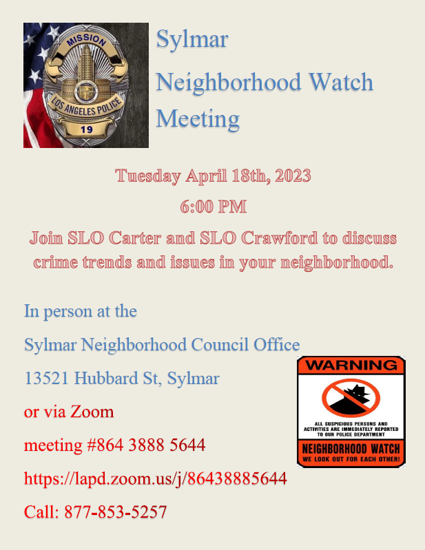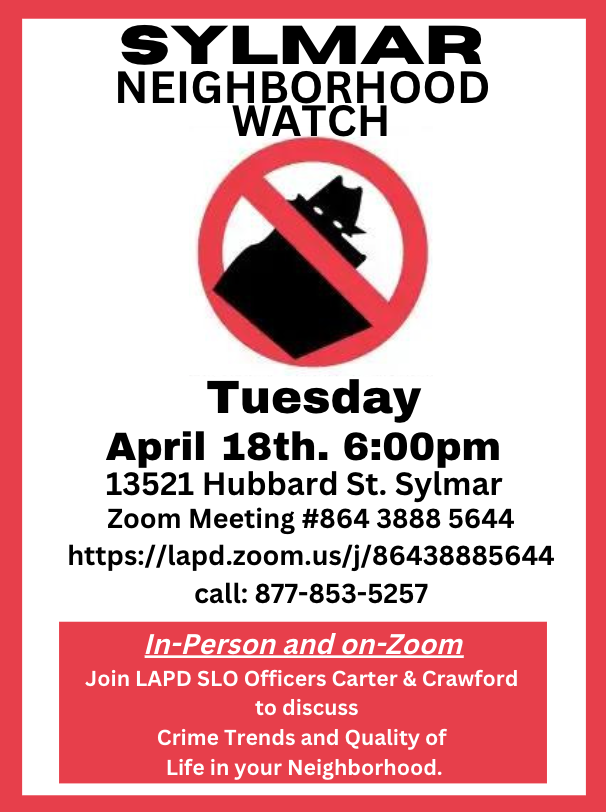 Join Sylmar's Senior Lead LAPD Officers Joseph Carter and Keith Crawford to discuss Crime Trends and Quality of Life in your Neighborhood
