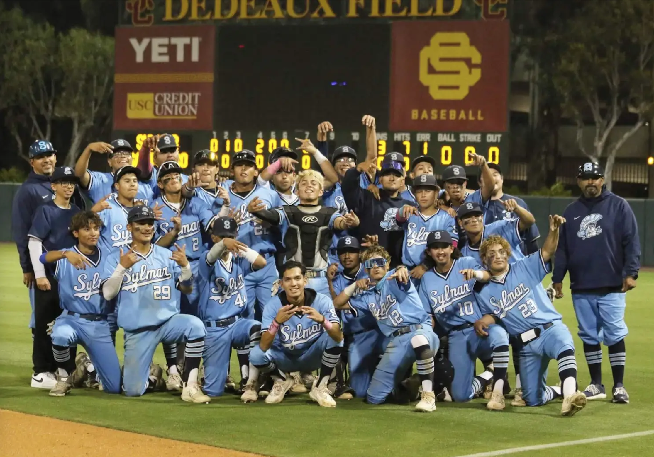 The Sylmar baseball team poses after beating San Pedro 3-0 in the City Section Division I semifinals at USC’s Dedeaux Field on Tuesday, May 23, 2023. (Photo courtesy of Sylmar Athletics)
