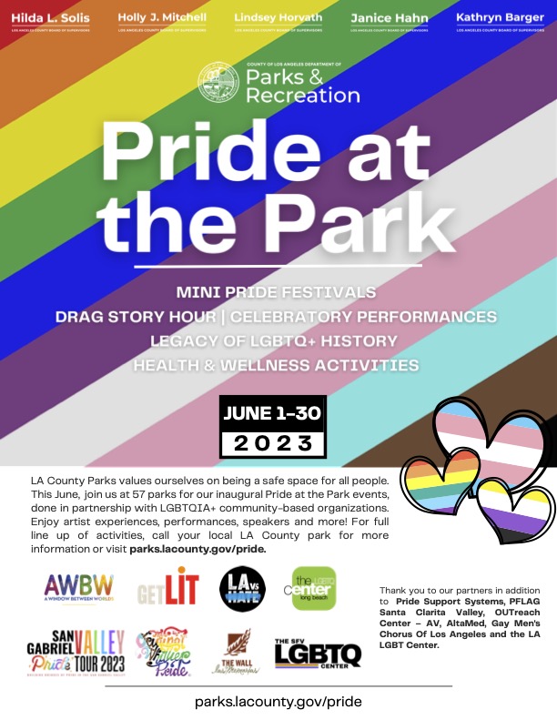 LA County Parks values itself on being a safe space for all people. This June, join us at 57 parks for our inaugural Pride at the Park events, done in partnership with LGBTQIA+ community-based organizations. Enjoy artist experiences, performances, speakers, and more! For a full lineup of activities, call your local LA County park for more information or visit parks.lacounty.gov/pride.