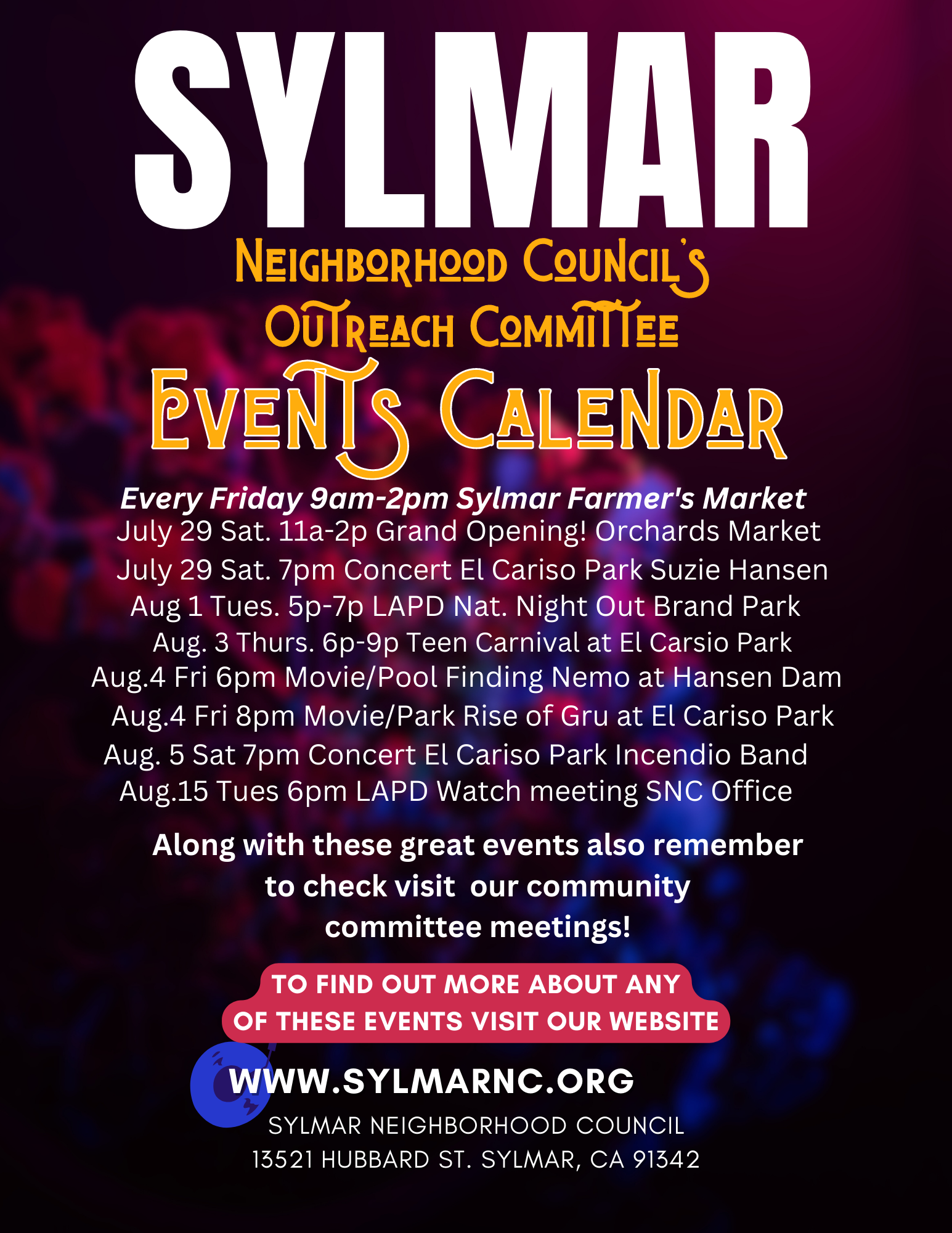 See Flyer for many other local events that your Sylmar Neighborhood Council is involved in. You can see more information and flyers for all the events by visiting www.sylmarnc.org