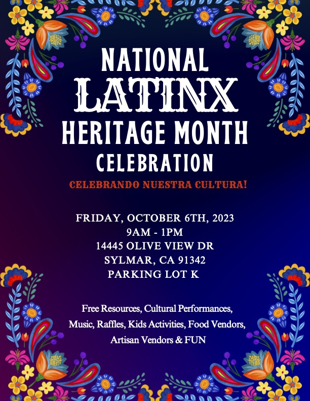 Olive View-UCLA Medical Center will be hosting its 1st Latinx Heritage Month Celebration. The event will take place on Friday, October 6th from 9 am -1 pm. We will have Free Resources, Cultural Performances, Music, Raffles, Kids Activities, Food Vendors, and Artisan Vendors.