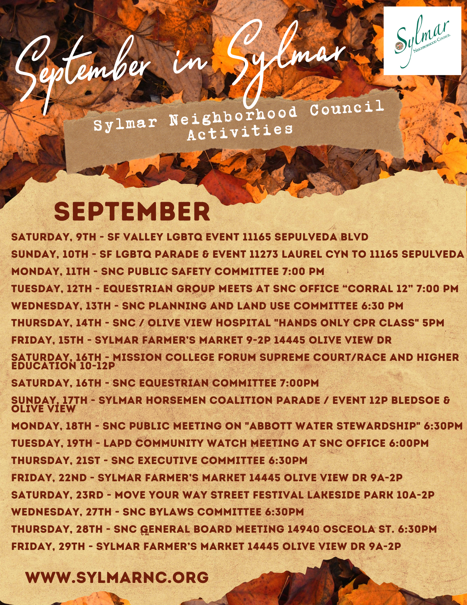 Sylmar Neighborhood Council events, activities and meetings for the month of September. Come join us in having a good time! For more community events, news, and activities visit www.SylmarNC.org
