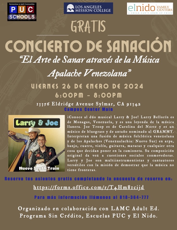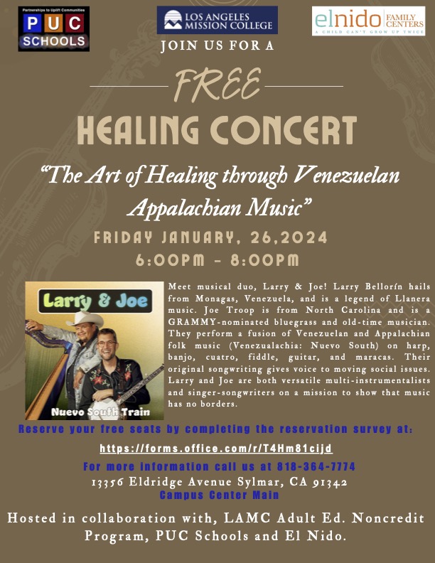 Nuestros invitados destacados son Larry y Joe que visitan Los Ángeles desde Carolina del Norte, interpretando una fusión de Música Folclórica Venezolana y de los Apalaches (Venezualachia: Nuevo Sur) en arpa, banjo, cuatro, violín, guitarra, maracas y cualquier otra cosa que decidan incluir en la mezcla.