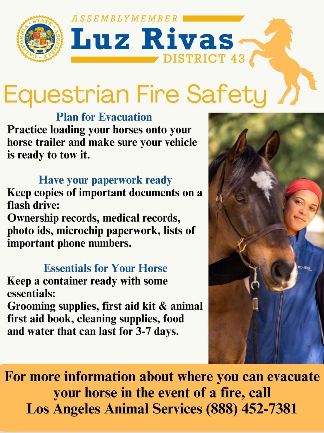 Hay there equestrians of California Assembly District 43! We have provided some essentials that you should keep in mind in case of a fire emergency. Click this link to learn more about how to make a stable plan for you and your horses: https://www.nfpa.org/Public-Education/Fire-causes-and-risks/Wildfire/TakeAction/Horses. Stay safe and saddle up!