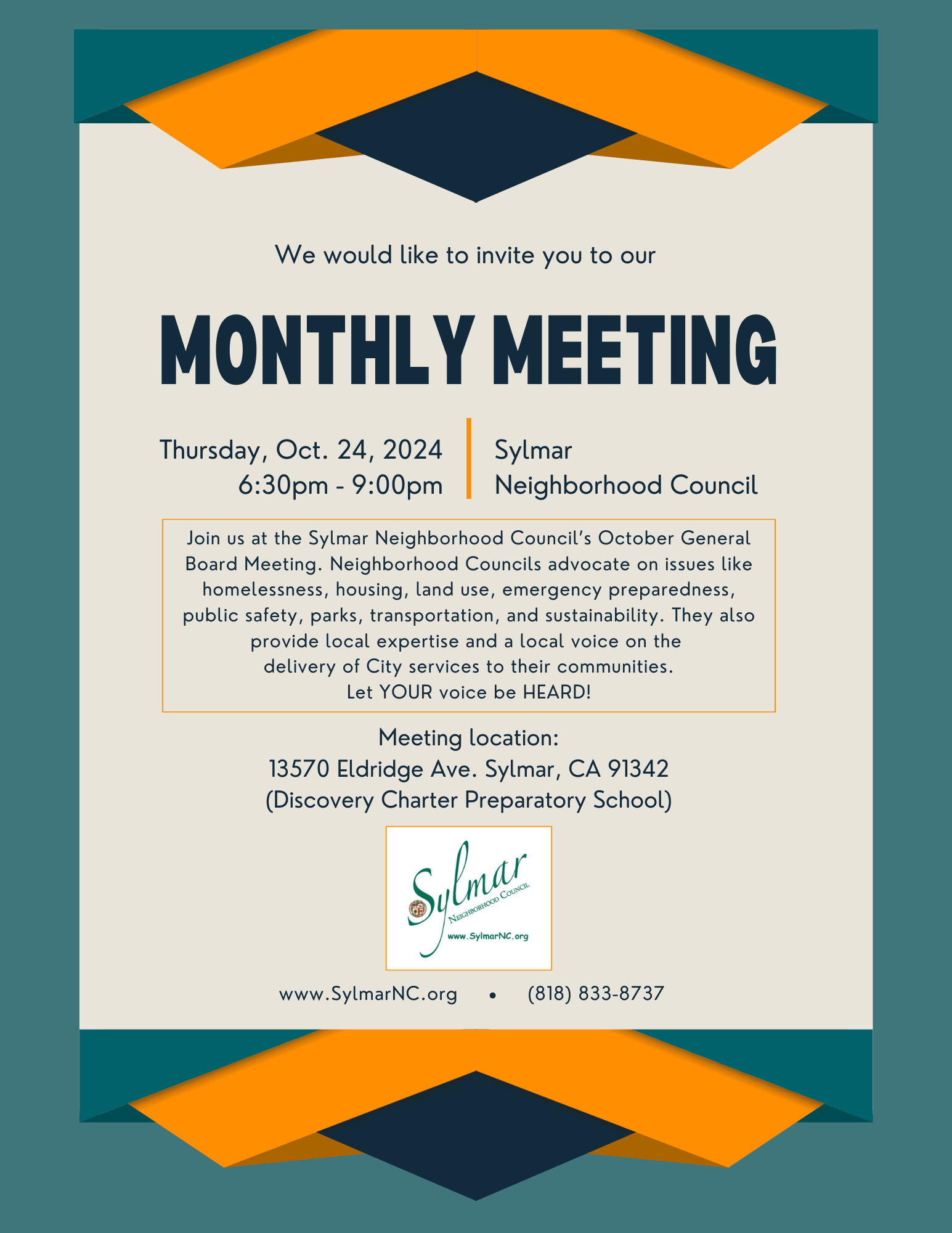 Join us at the Sylmar Neighborhood Council’s October General Board Meeting. Neighborhood Councils advocate on issues like homelessness, housing, land use, emergency preparedness, public safety, parks, transportation, and sustainability. They also provide local expertise and a local voice on the