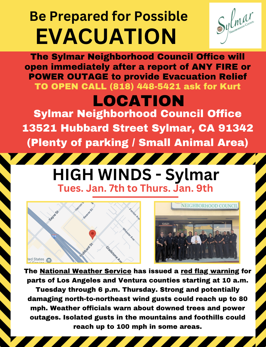 The Sylmar Neighborhood Council Office will open immediately after a report of ANY FIRE, or POWER OUTAGE to provide Evacuation Relief