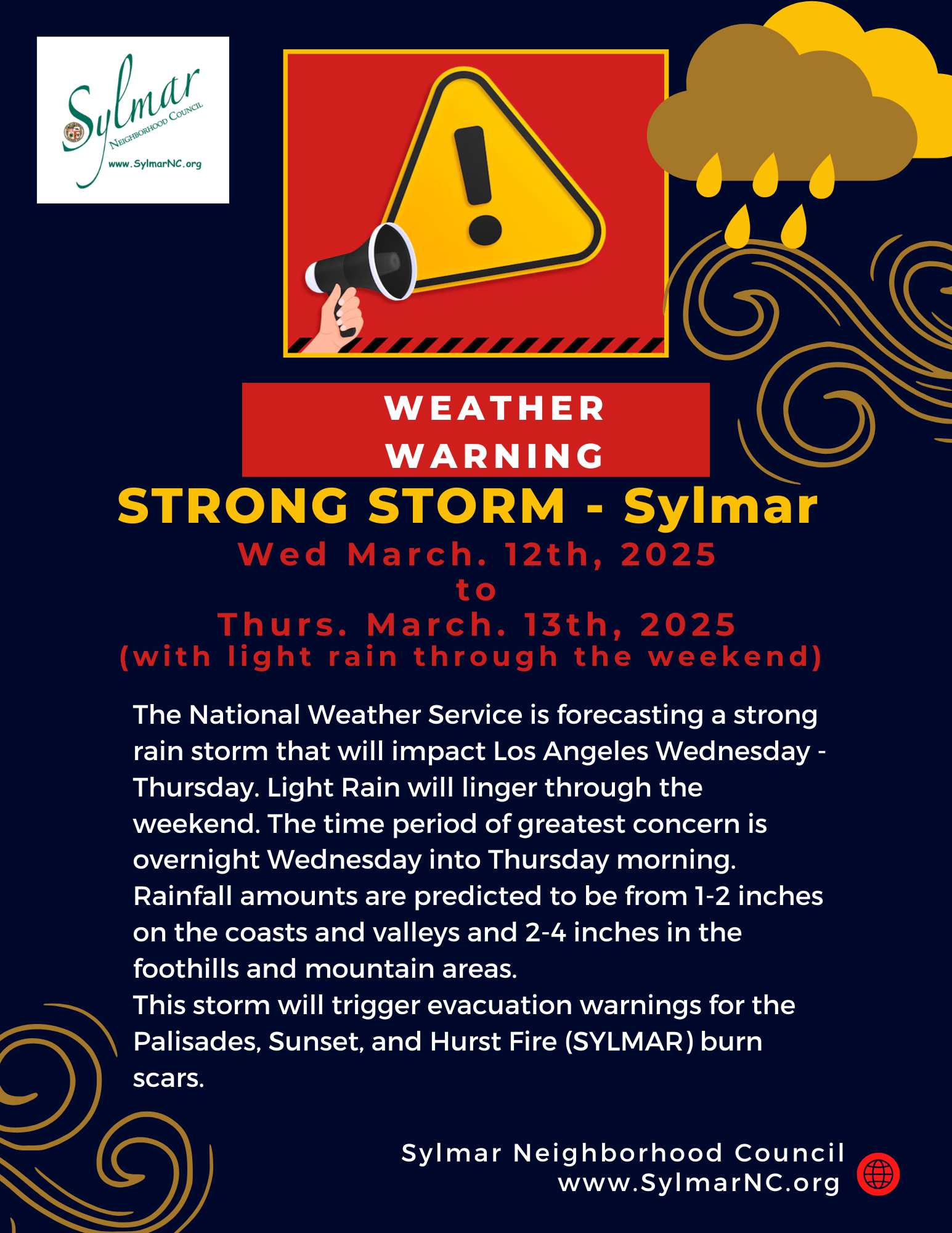 City of Los Angeles Emergency Alert: The National Weather Service is forecasting a strong rain storm that will impact Los Angeles Wednesday - Thursday. Light Rain will linger through the weekend. The time period of greatest concern is overnight Wednesday into Thursday morning. Rainfall amounts are predicted to be from 1-2 inches on the coasts and valleys and 2-4 inches in the foothills and mountain areas. A Flood Watch has been issued City-wide. Get ready and take extra precautions, especially if you are in an area impacted by the recent wildfires.