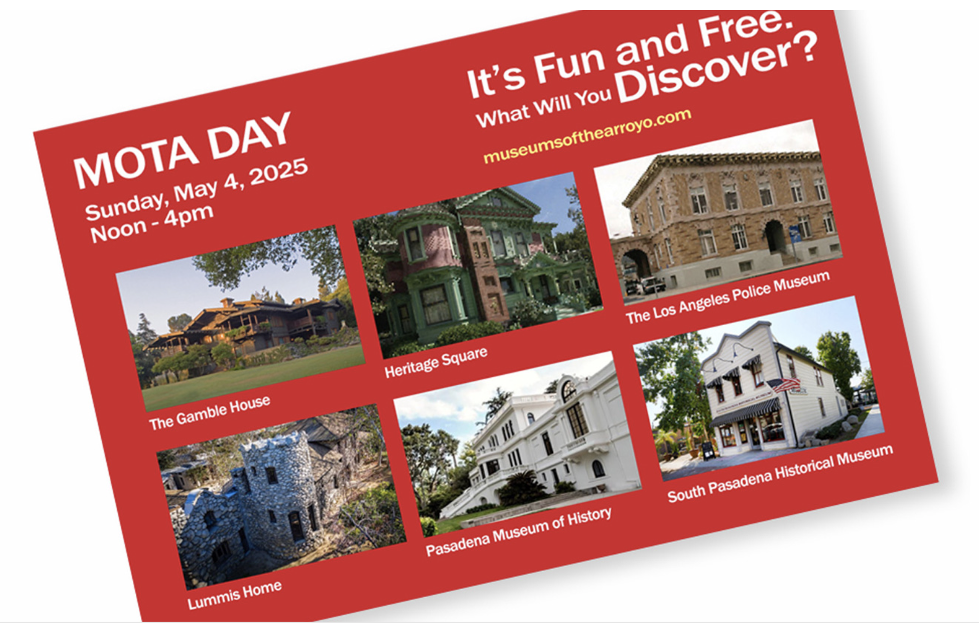 MUSEUMS OF THE ARROYO DAY IS COMING, May 4, 2025, 12:00 pm-4:00 pm. Six local museums in LA, Pasadena, and South Pasadena open their doors to the public for free admission along with cultural events, kid’s activities, and family fun. Free shuttles connect: