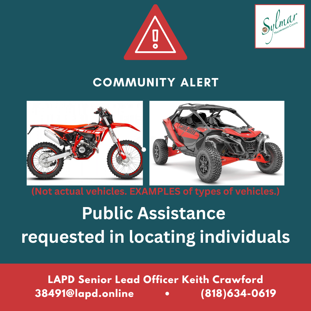 Alert. Greetings Sylmar. We have noticed the riders of off-road motorcyclists and ATVs in the Sylmar area are becoming more problematic. We know they off-road in the hills and basin near Mission College, and one major corridor they travel on is Eldridge Av. They of course are NOT street-legal, and their riding groups have escalated their recklessness. I want to know who these individuals are, so we can have a discussion.