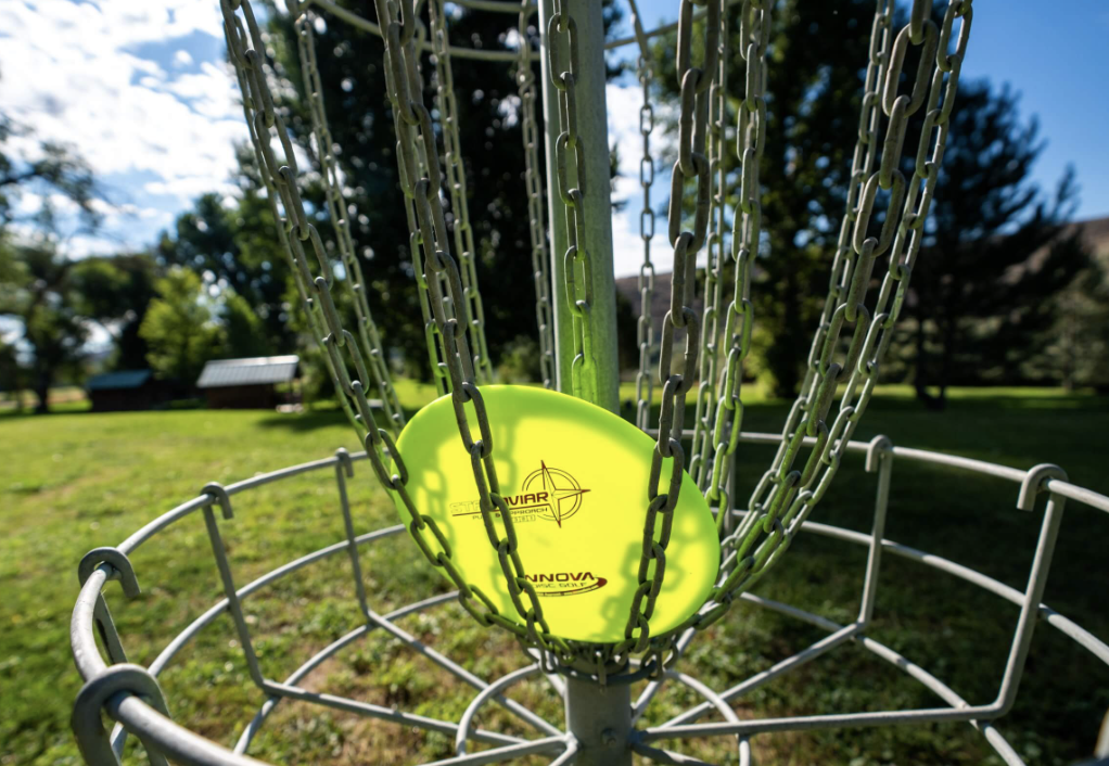 Instead of holes in the ground, disc golf uses above-ground targets, typically metal baskets with chains.