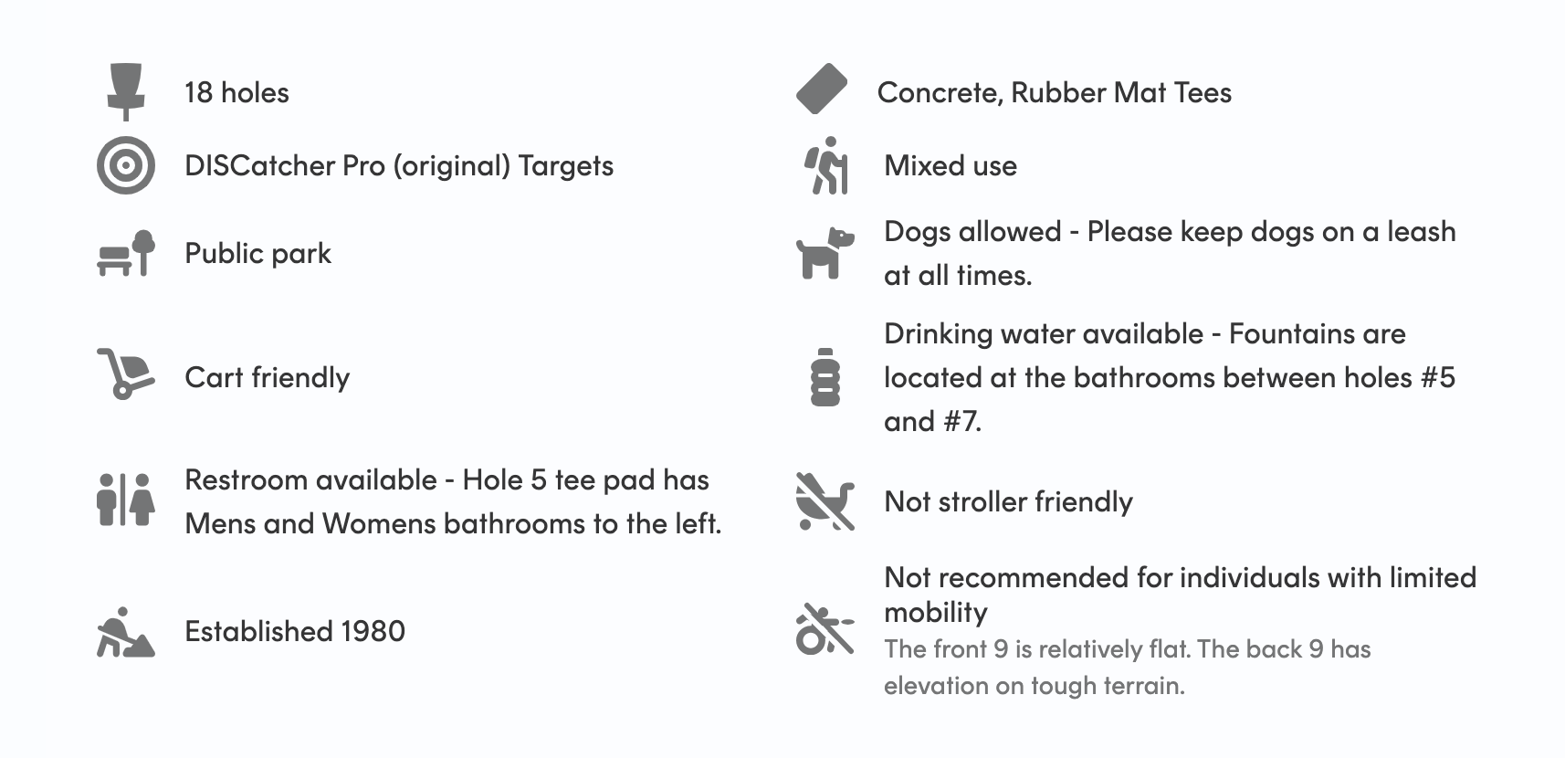 **You can purchase discs "frisbees" on site (hours unknown) or at the convenience store "Village Market" 13530 Eldridge (corner of Sayre/Eldridge), Bottom of the hill on the way to the park.