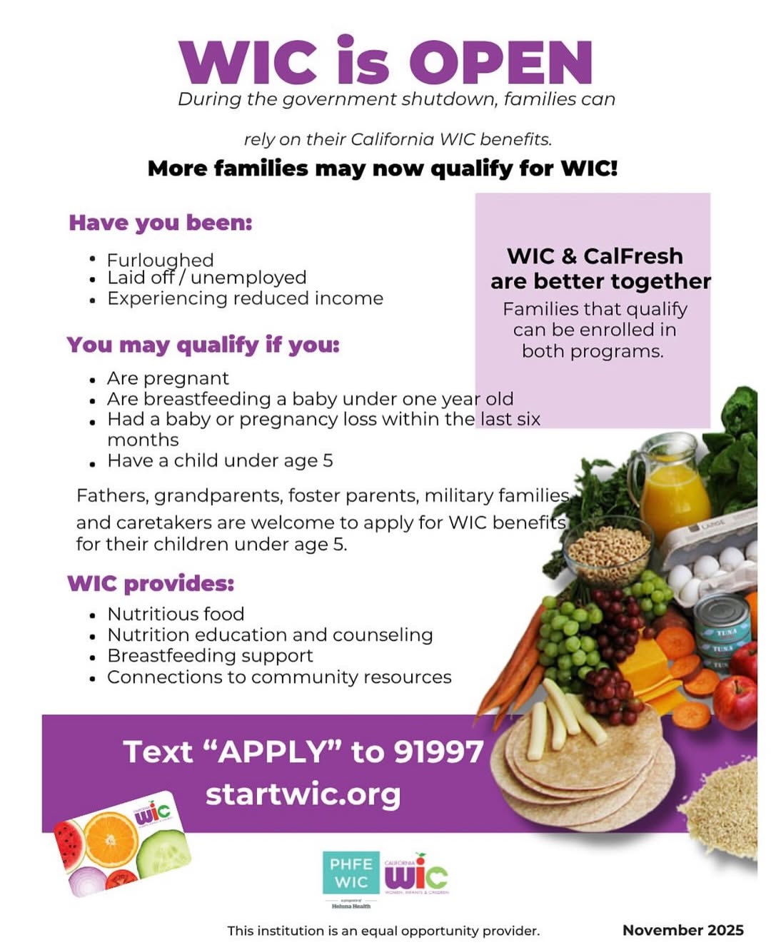 WIC is available to anyone who lives in California and meets the program guidelines regardless of race, color, national origin, gender, religion, age, or disability. We welcome newly pregnant individuals, military families, working families, migrant families, fathers, foster parents, and legal guardians with eligible children. Families who receive Medi-Cal/Medicaid, CalFresh/SNAP, or CalWORKs qualify.