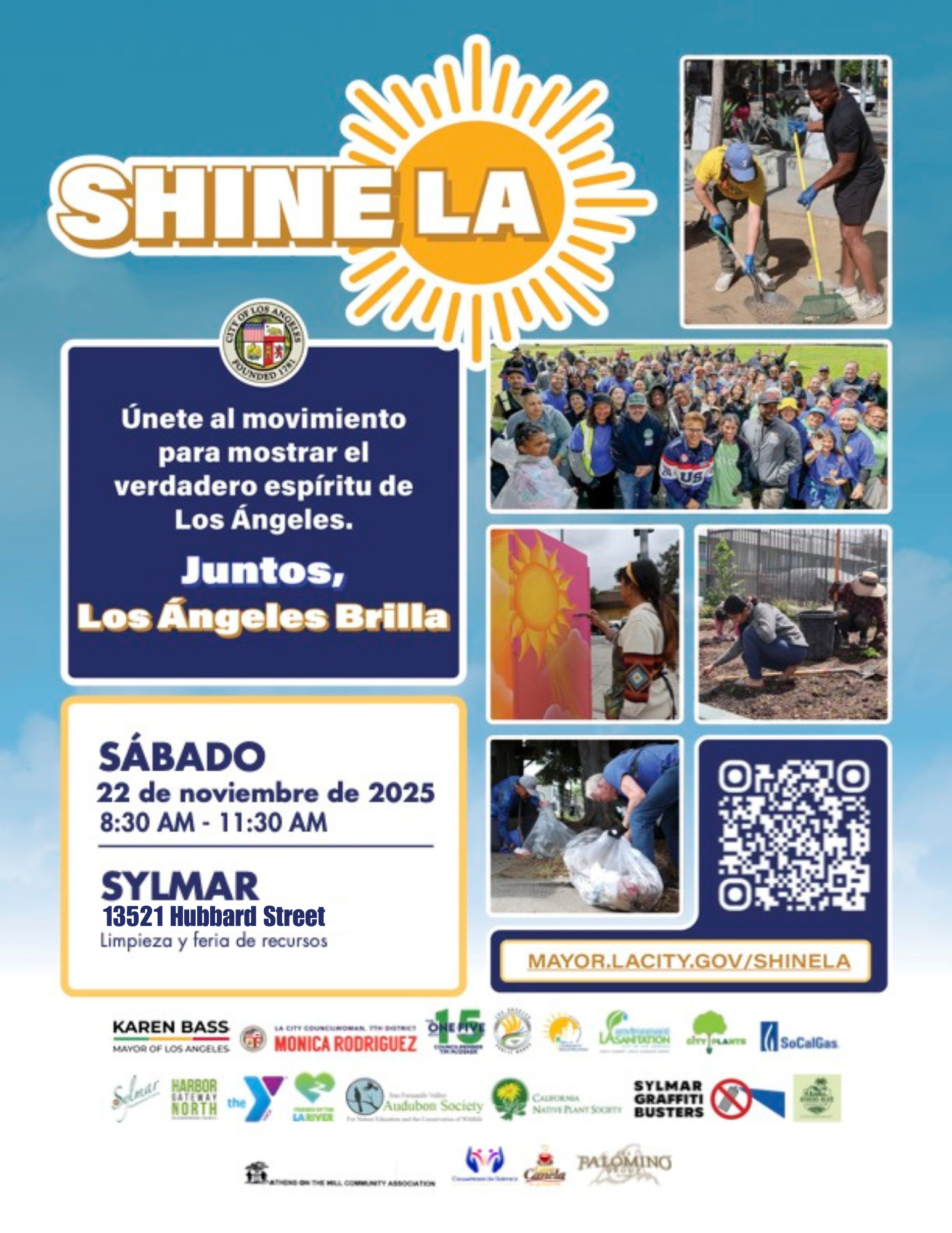 Sylmar - Shine/LA will be held on Saturday, November 22nd, from 8:30am to 11:30am. The meet-up headquarters will be the Sylmar Neighborhood Council's office at 13521 Hubbard Street, Sylmar, CA 91342 (Near Yum Yum Donuts)