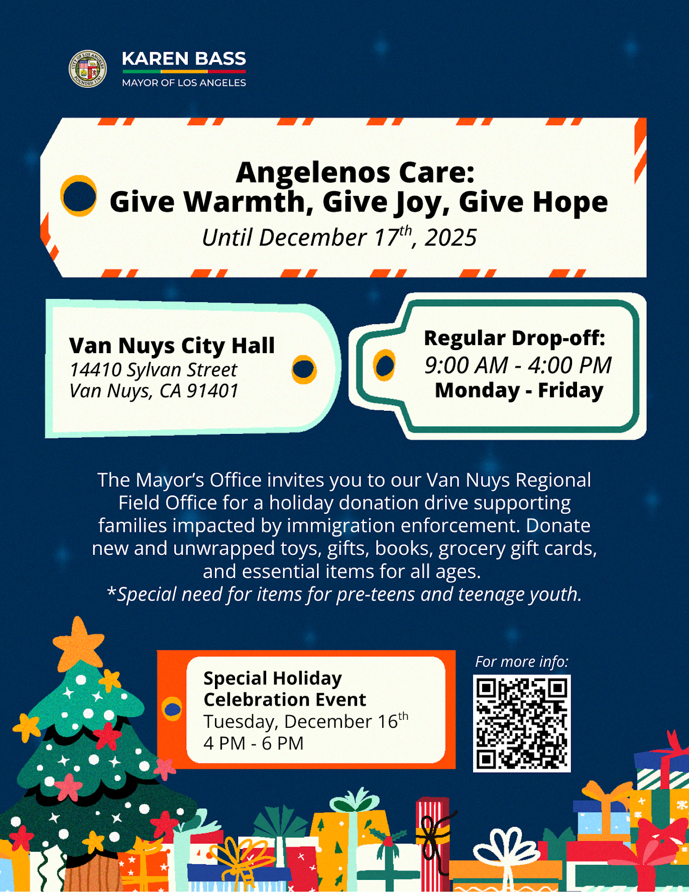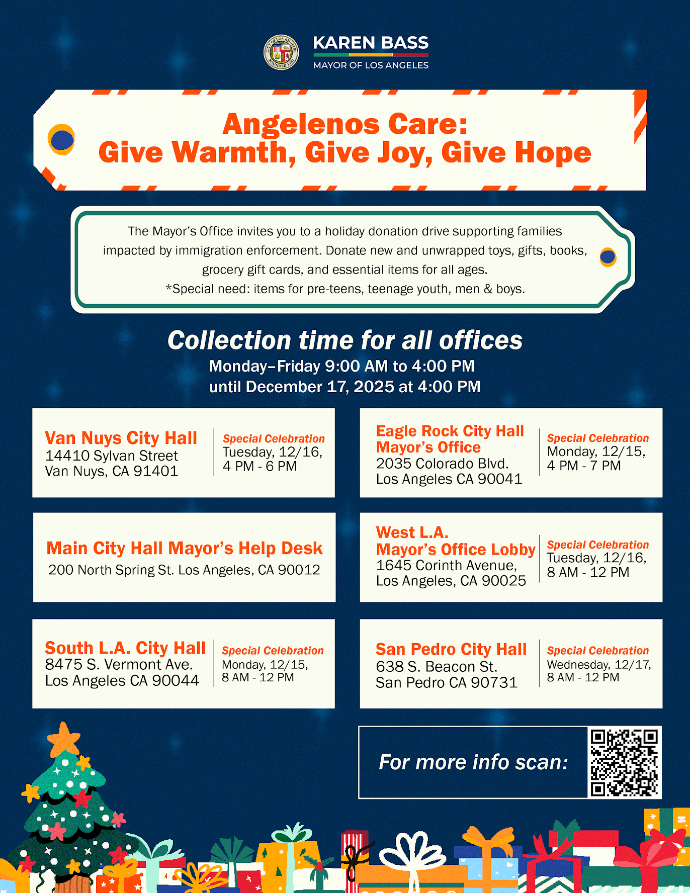 LOS ANGELES –This holiday season, Mayor Karen Bass invites Angelenos to join a citywide effort to make a meaningful and lasting difference for children and families across Los Angeles. To support families impacted by immigration enforcement, regional City facilities across Los Angeles are now accepting donations of new toys, gifts, books, sport equipment and essential items—including grocery cards and warm winter accessories. These donations serve as more than seasonal gifts; they are powerful reminders that our city sees, supports, and stands with every family that calls Los Angeles home. Flyers with drop-off locations can be found here.