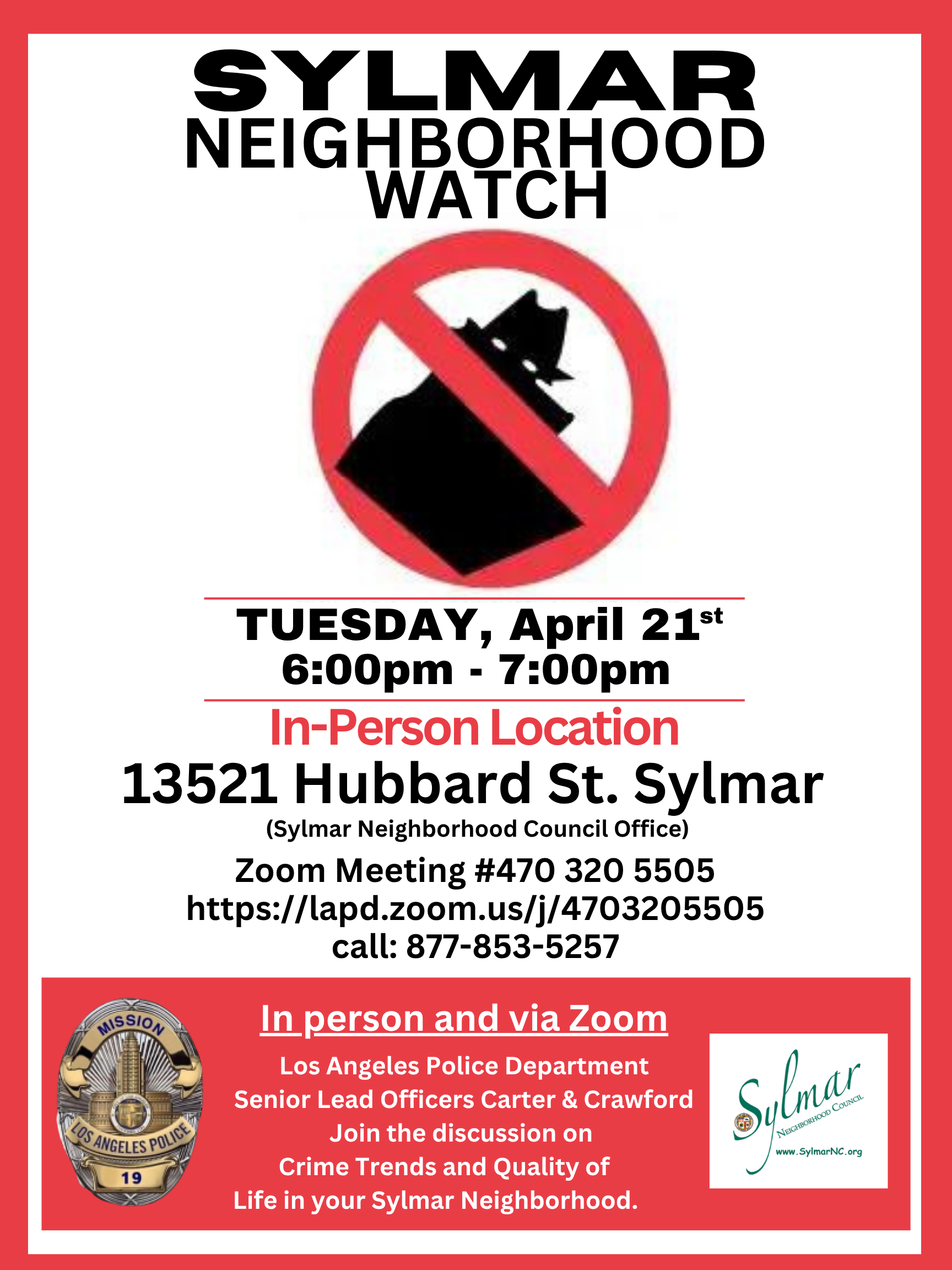 The Second Wednesday of Every Month Starting at 6:30pm: Meeting Location is at the Sylmar Neighborhood Council Office located at 13521 Hubbard Street, Sylmar California 91342 - at the Intersection of Hubbard and Gladstone Streets, near the Yum-Yum Donuts.