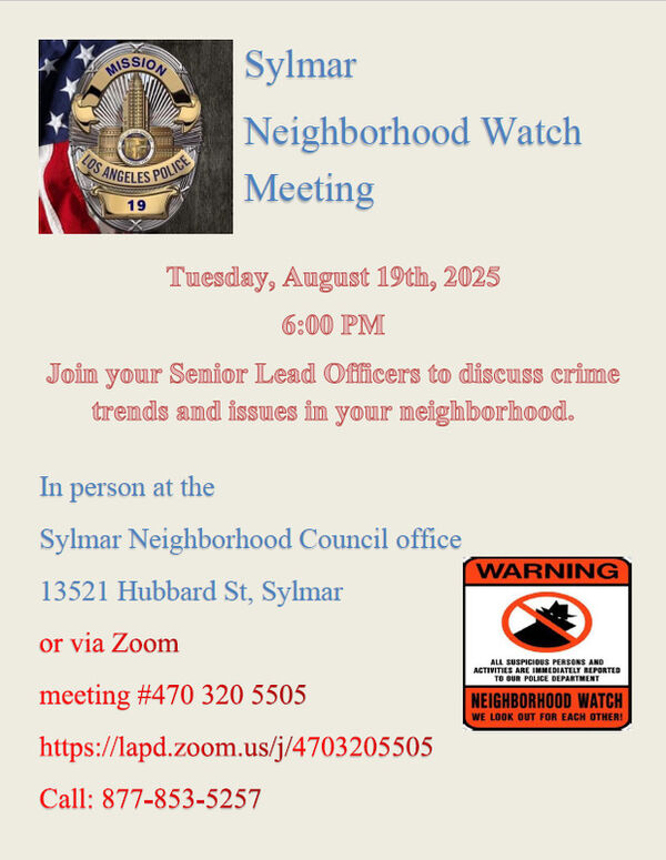 The Second Wednesday of Every Month Starting at 6:30pm: Meeting Location is at the Sylmar Neighborhood Council Office located at 13521 Hubbard Street, Sylmar California 91342 - at the Intersection of Hubbard and Gladstone Streets, near the Yum-Yum Donuts.