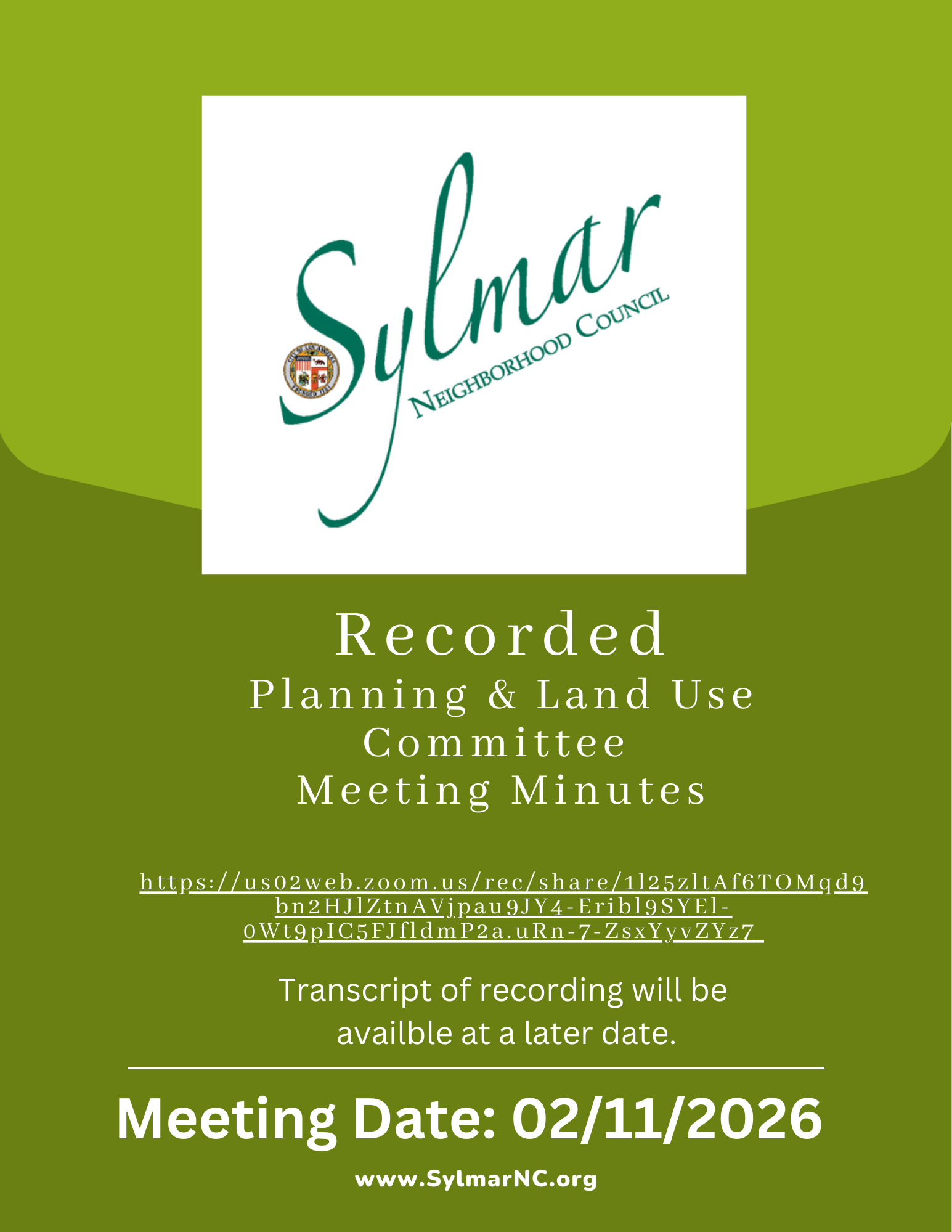 The Planning and Land Use Committee promotes community input and involvement in land use, planning, beautification, and appropriately sized public, commercial and residential development in Sylmar. It provides recommendations to the SNC Board of Directors regarding issues in order to improve the quality of life in Sylmar. The PLUC Committee as it is known consists of community stakeholders and Board members.