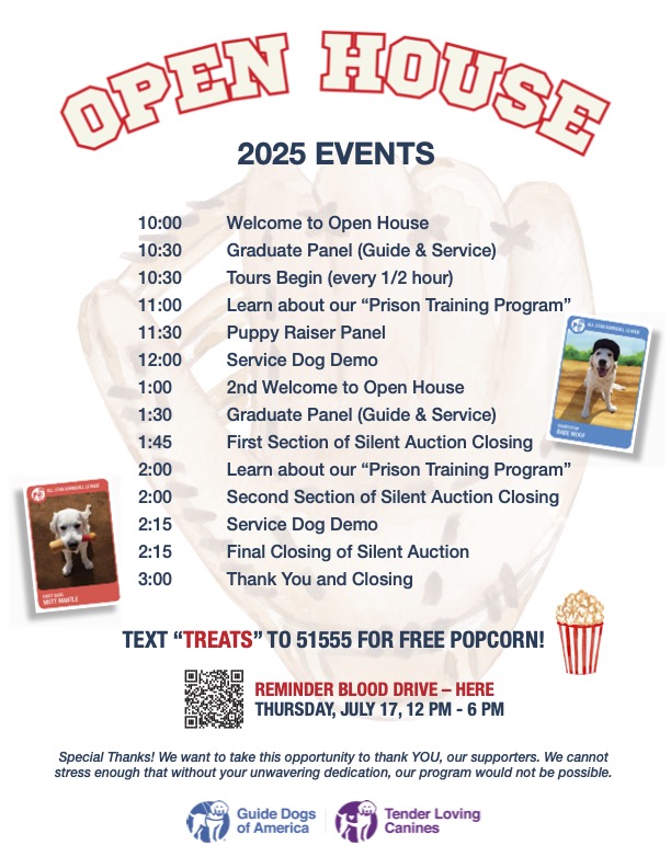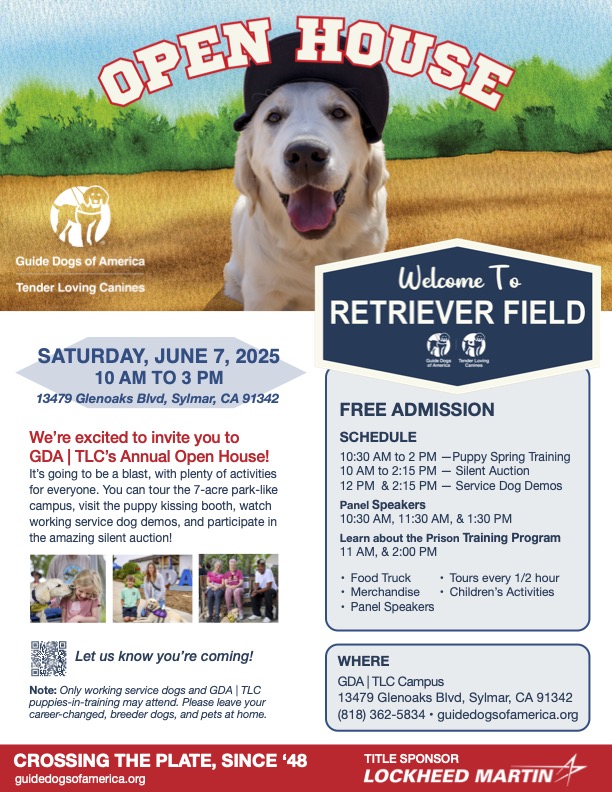 We’re excited to invite you to GDA | TLC’s Annual Open House! It’s going to be a blast, with plenty of activities for everyone. You can tour the 7-acre park-like campus, visit the puppy kissing booth, watch working service dog demos, and participate in the amazing silent auction!