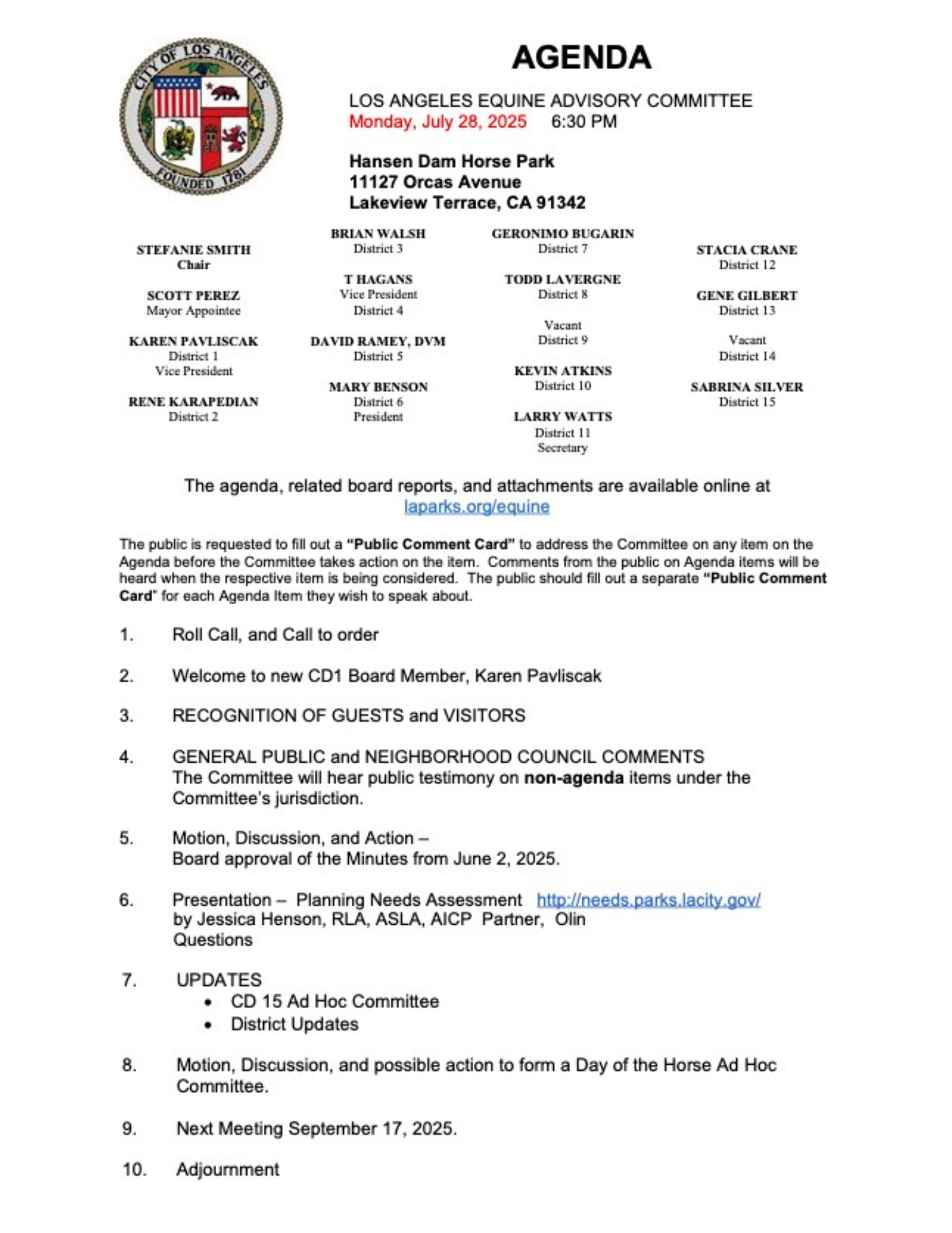 The agenda, related board reports, and attachments are available online at https://www.laparks.org/equine