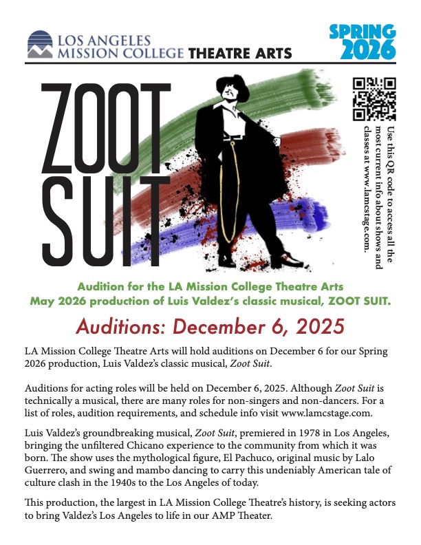 "Auditions for acting roles will be held on December 6, 2025. Although Zoot Suit is technically a musical, there are many roles for non-singers and non-dancers. For a list of roles, audition requirements, and schedule info, visit www.lamcstage.com.