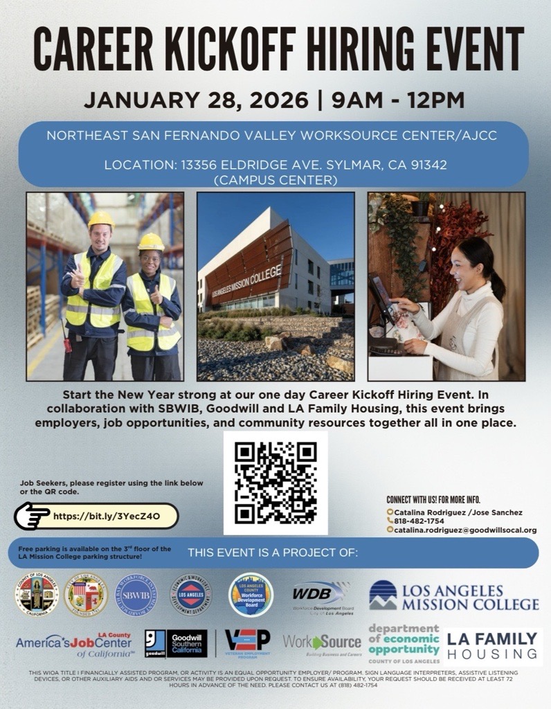 Join us this Wednesday, January 28th, at this Career Kickoff Hiring Event! A collaborative effort between LA Family Housing, America’s Job Center of California (AJCC), and the South Bay Workforce Investment Board (SBWIB).