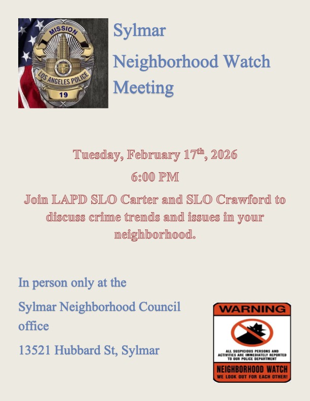 The Second Wednesday of Every Month Starting at 6:30pm: Meeting Location is at the Sylmar Neighborhood Council Office located at 13521 Hubbard Street, Sylmar California 91342 - at the Intersection of Hubbard and Gladstone Streets, near the Yum-Yum Donuts.