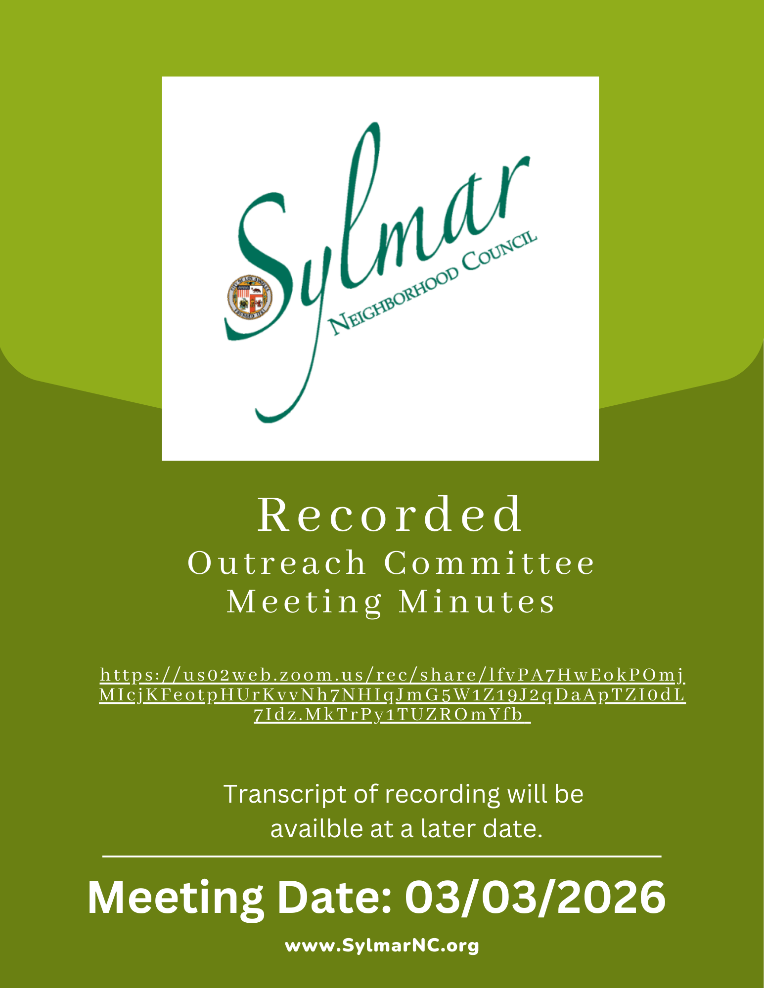 The meeting Location is at the Sylmar Neighborhood Council Office located at 13521 Hubbard Street, Sylmar California 91342 - at the Intersection of Hubbard and Gladstone Streets, near the Yum-Yum Donuts.