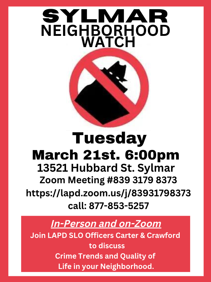21Tue 6:00 pm - LAPD • Sylmar Neighborhood Watch (MARCH) W/ Senior Leads