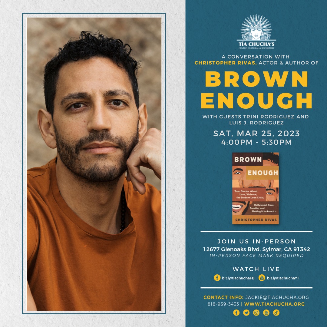 Trini and I will be hosting this important dialogue with writer/actor Christopher Rivas on his book "Brown Enough." Please join us live at Tia Chucha's Centro Cultural & Bookstore on March 25, 4 pm to 5:30 pm. It will also be live-streamed.