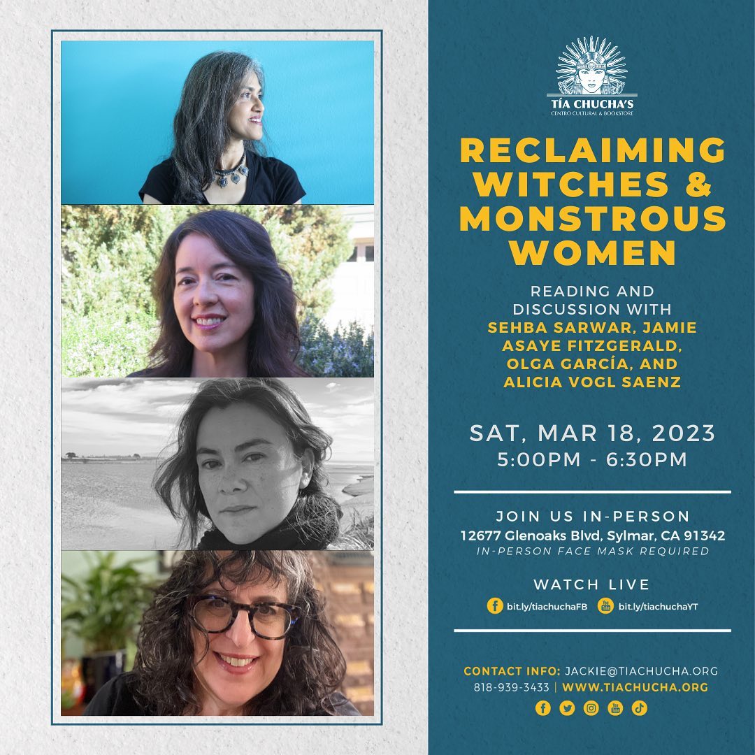 Join us this Saturday, March 18th, in welcoming writers Sehba Sarwar, Jamie Asaye FitzGerald, Olga García, and Alicia Vogl Saenz! In this reading and discussion, featured writers will embrace and celebrate folklore that mythologizes women and aim to shift the lens through which women witches and victims are viewed.
