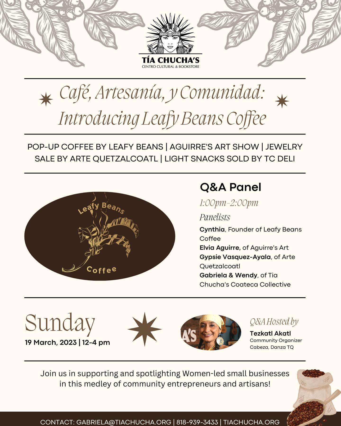 "Meet our panelists + vendors for this Sundays event, Café, Artesanía, y Comunidad: Introducing Leafy Beans Coffee