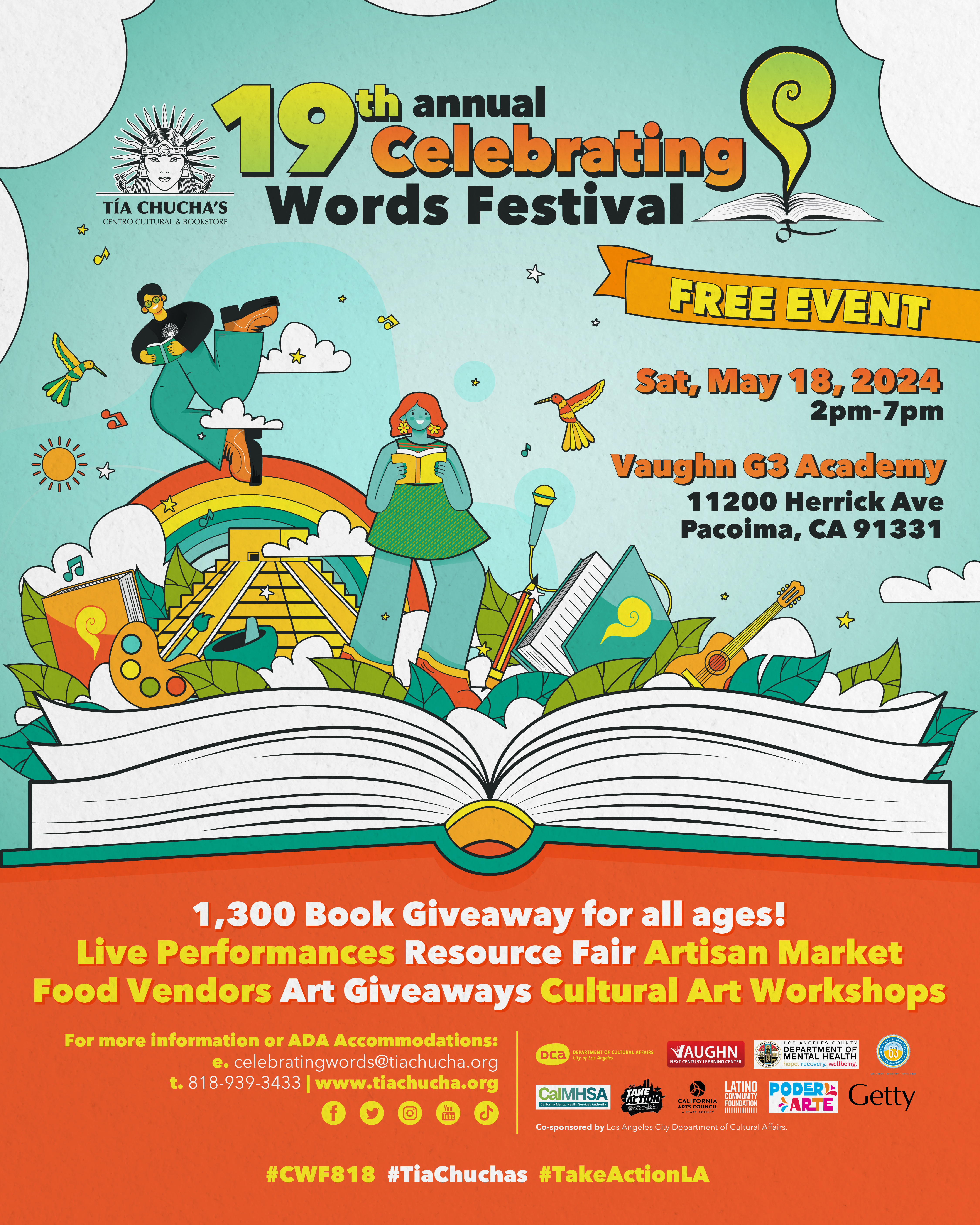 The 19th annual Celebrating Words Festival (CWF) will take place on May 18, 2024 from 2–7 PM at Tia Chucha's Centro Cultural in Sylmar, California. The festival will explore themes like memory and intergenerational connections.