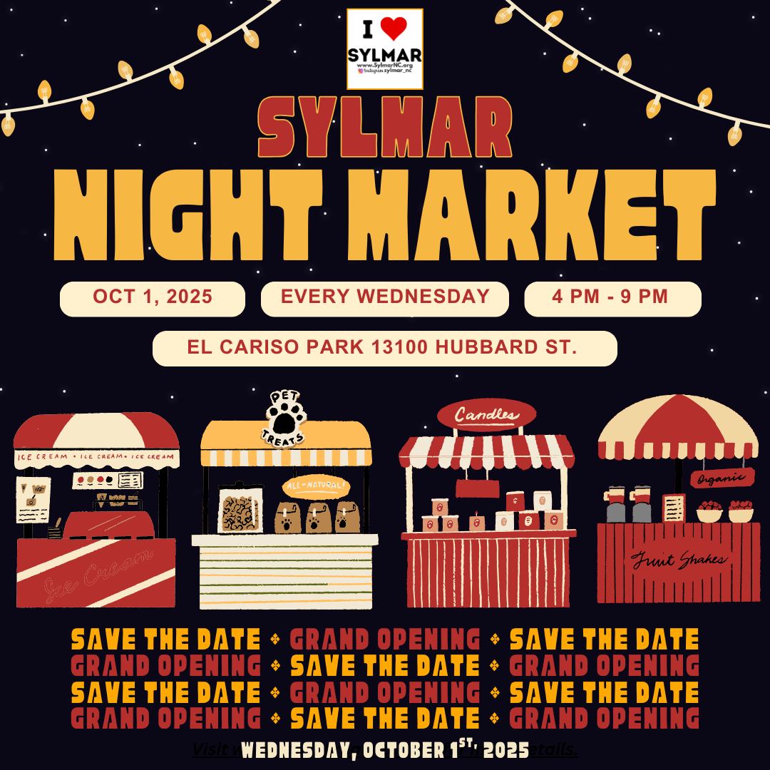 Grand Opening of Sylmar's Night Market. This will take place every Wednesday beginning on October 1st. 2025 Time for the Night Market is 4:00 pm to 9:00 pm. Location - El Cariso Park (swimming pool parking lot) 13100 Hubbard Street, Sylmar, CA 91342