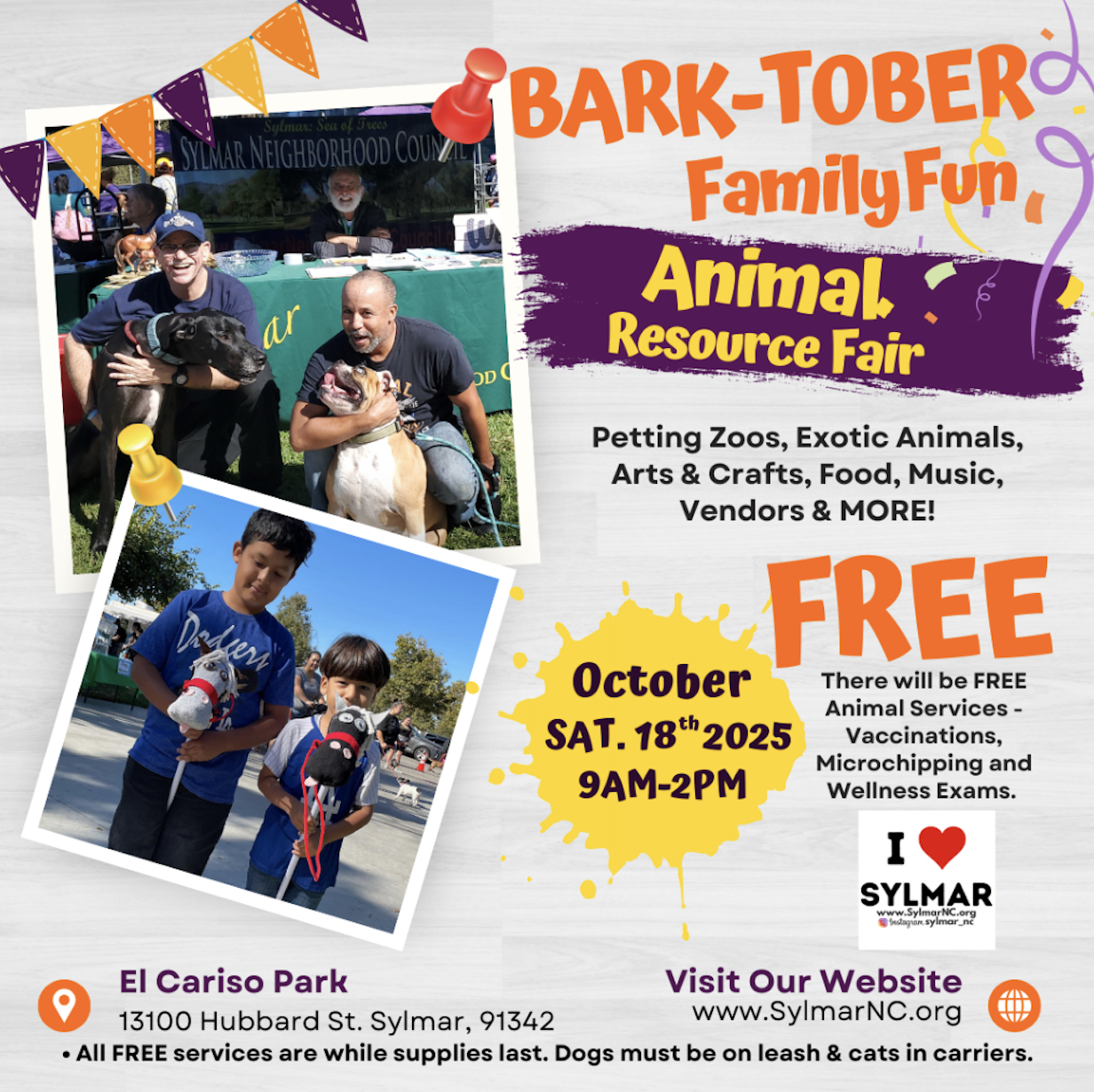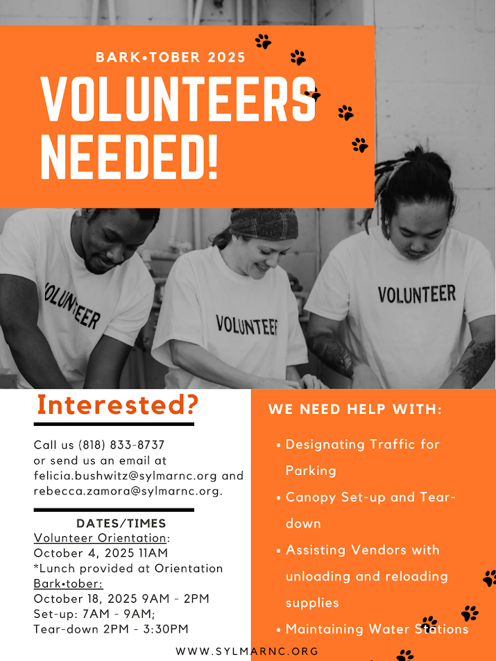 We are looking for community members who are intersted in volunteering at Bark-Tober, Sylmar's Animal Resource Fair which will be held on Saturday, October 18th at El Cariso Regional Park. In advance of the event, we will be holding an orientation at the SNC office where volunteers can learn about the kind of support needed, meet their leaders and fellow volunteers and enjoy some PIZZA!