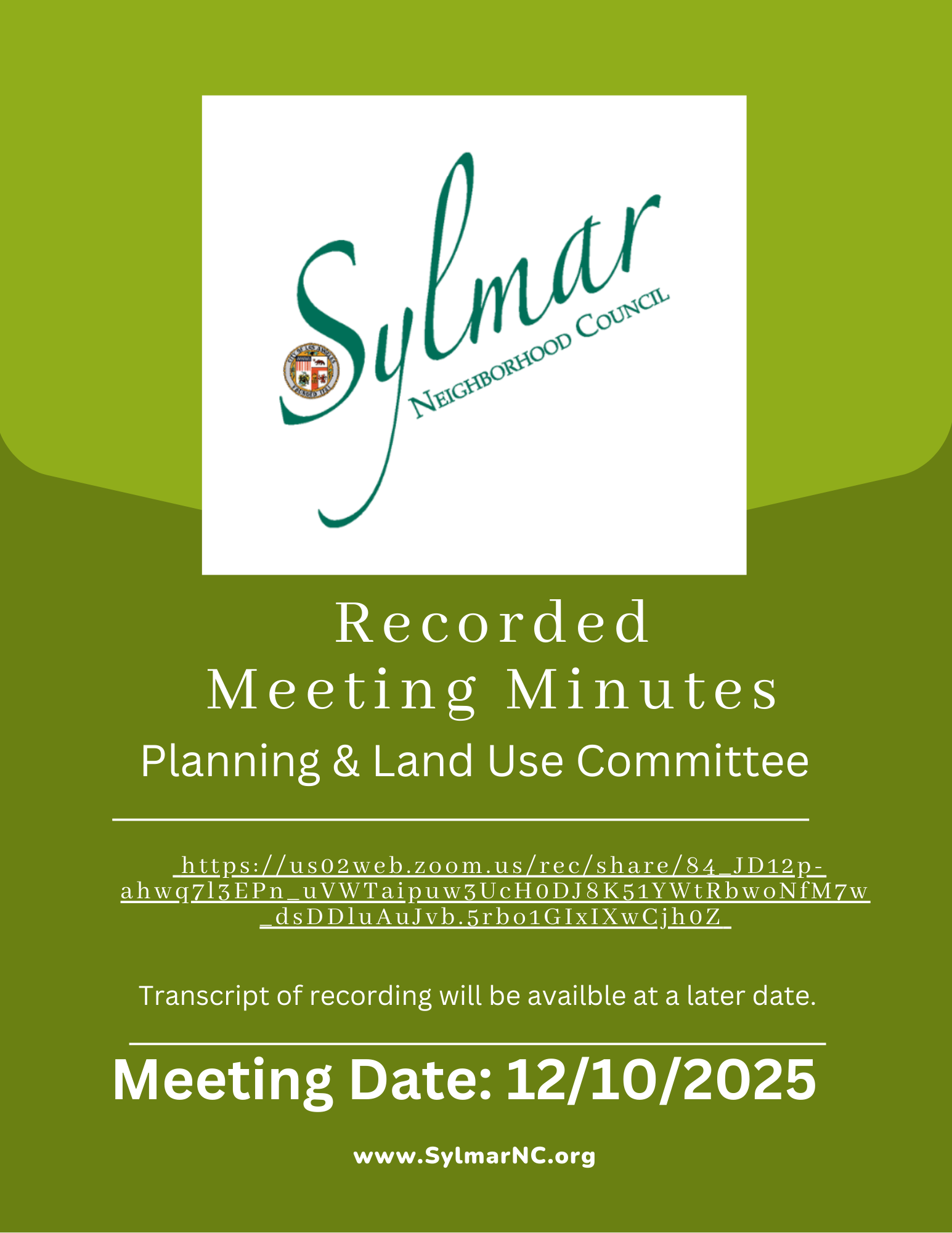 The Second Wednesday of Every Month Starting at 6:30pm: Meeting Location is at the Sylmar Neighborhood Council Office located at 13521 Hubbard Street, Sylmar California 91342 - at the Intersection of Hubbard and Gladstone Streets, near the Yum-Yum Donuts.