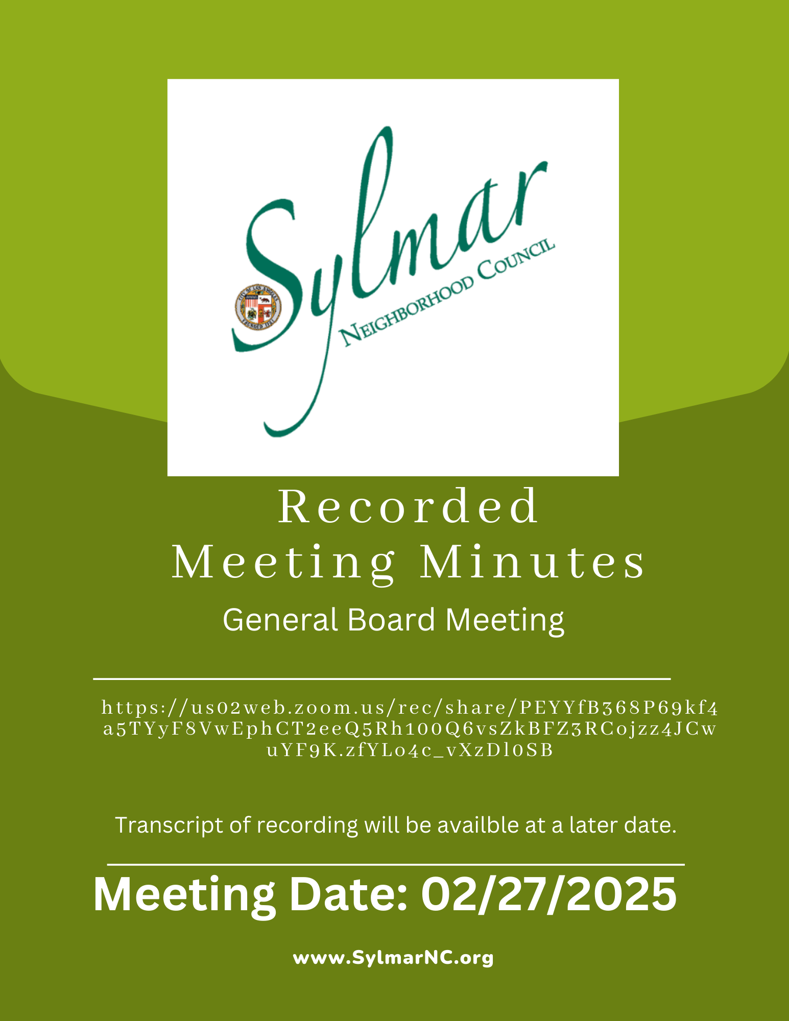 The Sylmar Neighborhood Council's regularly scheduled full board meeting is held on the 4th Thursday of the month at 6:30 pm.