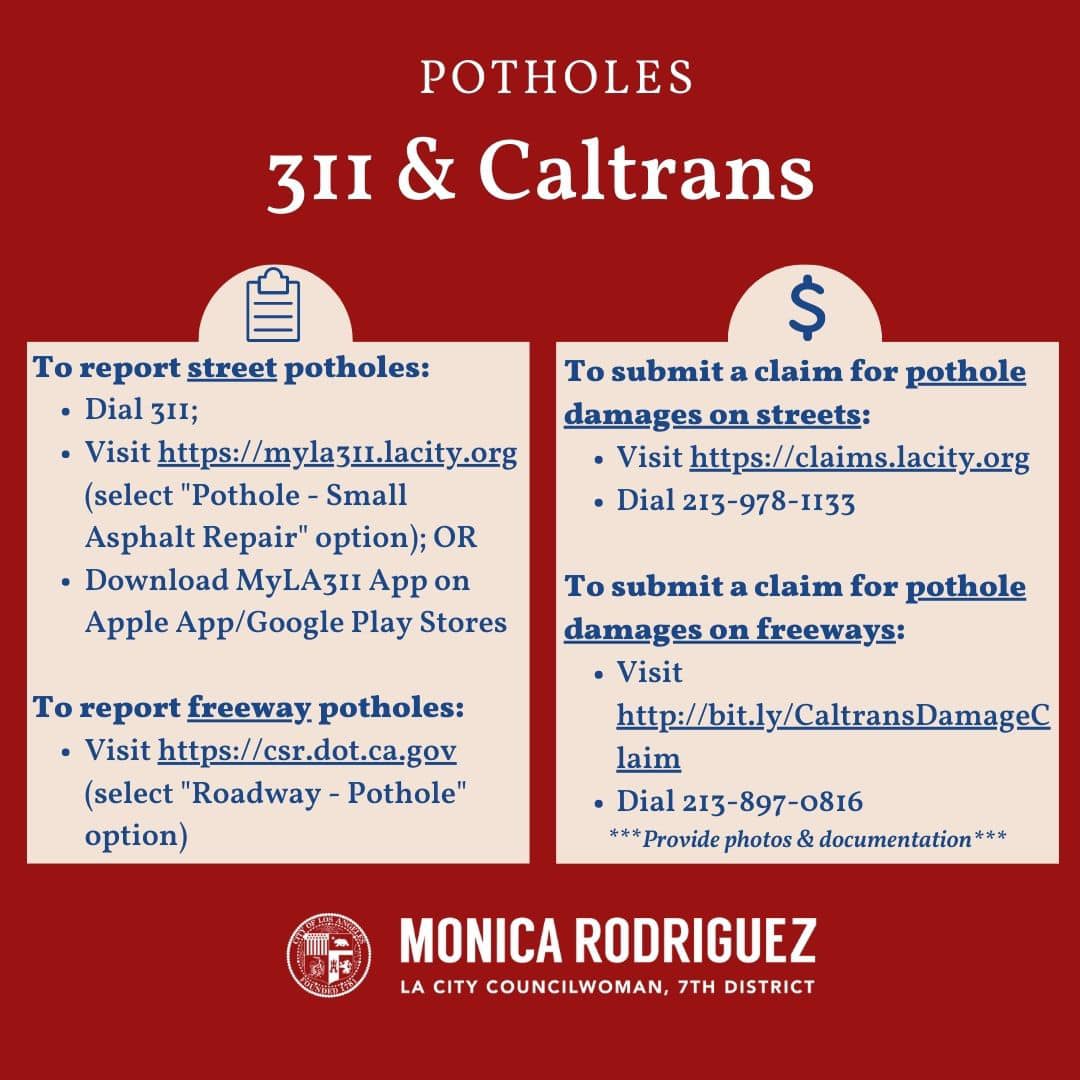 • Submit a claim for damages due to a pothole on the STREET - Dial (213) 978-1133