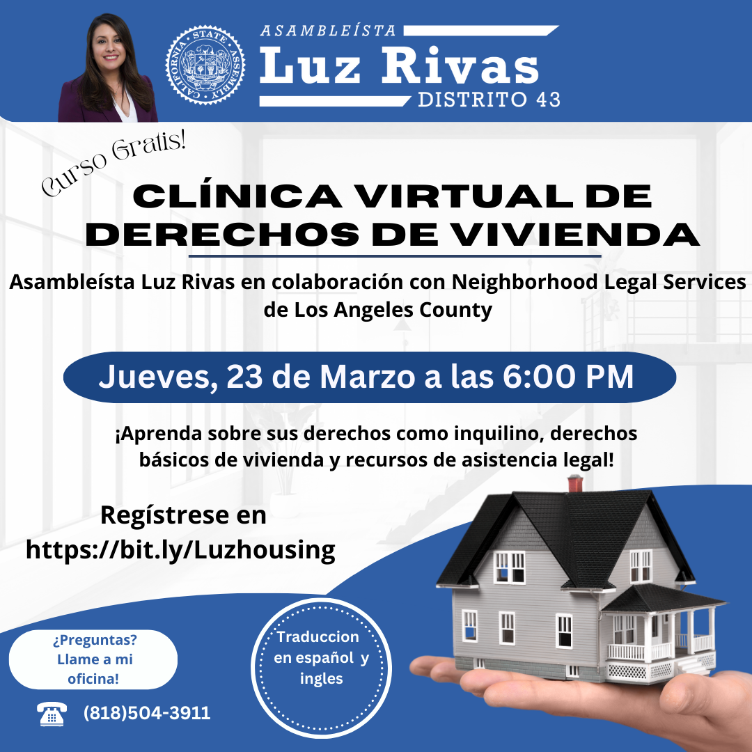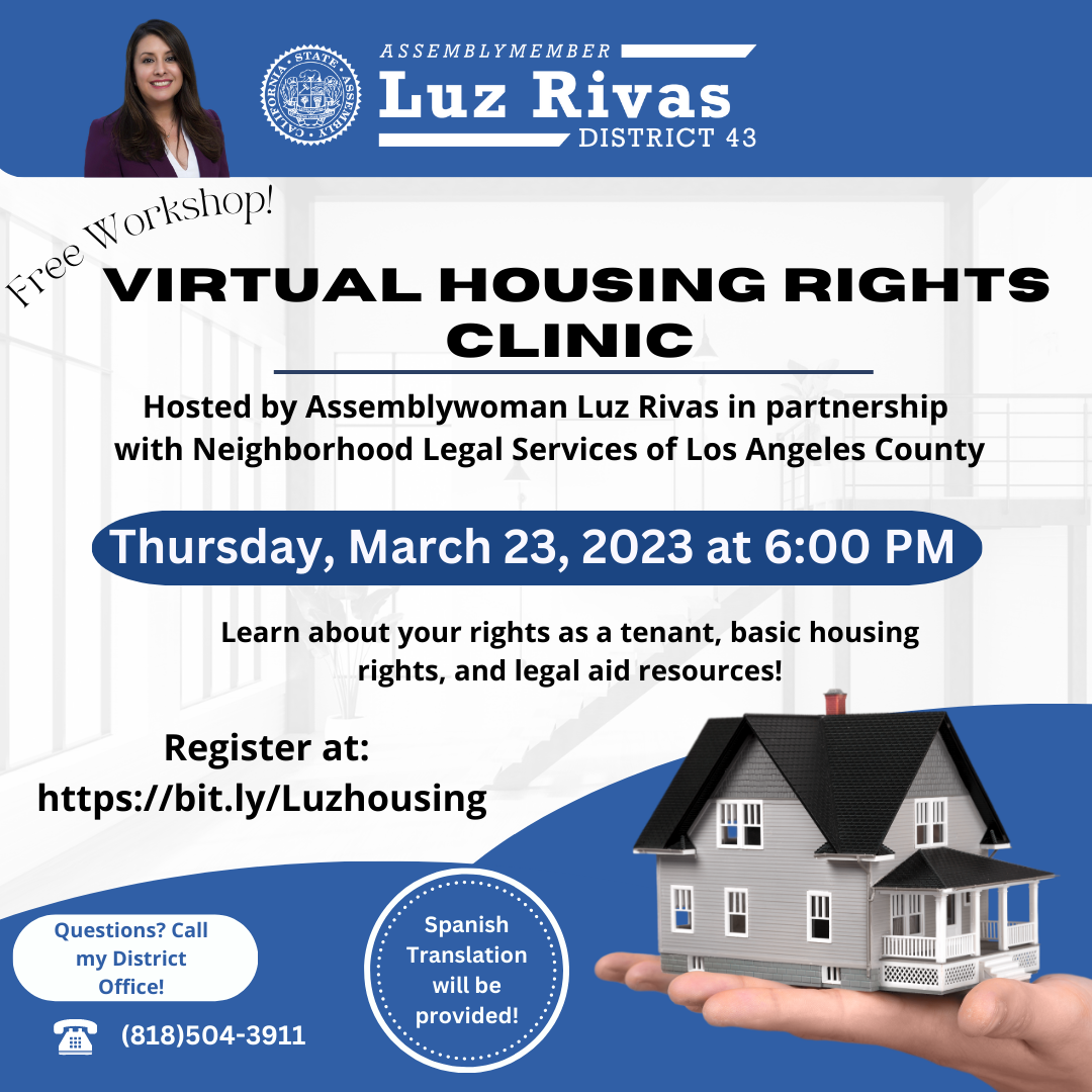 Únase a nuestra asambleísta estatal de CA, Luz Rivas, el 23 de marzo a las 6:00 p. m. Conoce tus derechos como inquilino y más.