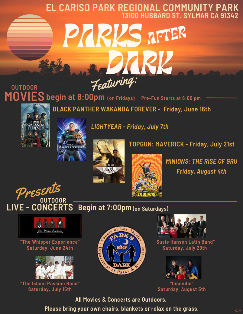 SYLMAR • Parks After Dark at El Cariso Park 13100 Hubbard Street Sylmar, CA 91342 Movie nights on Fridays & Concert nights on Saturdays