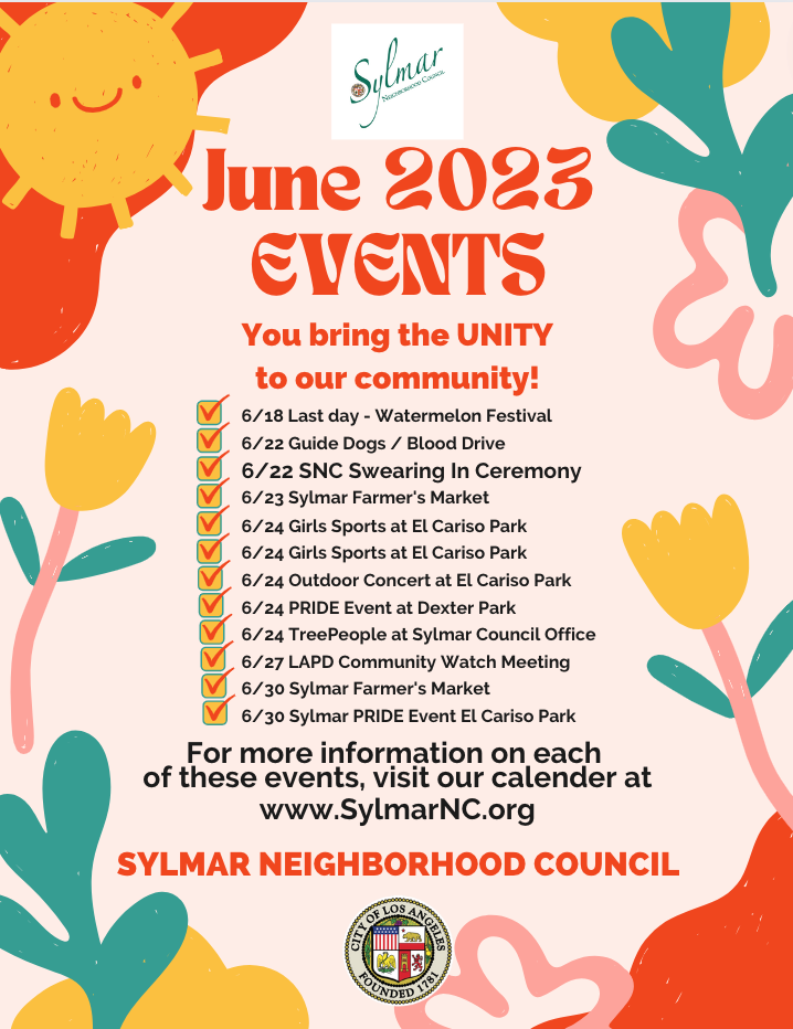 At the Sylmar Neighborhood Council's June General Board meeting, We will be joined by our Calif. State Senator Caroline Menjivar, and our State Assemblywoman Luz Rivas (More special guests.) in honoring Sylmar's Council for their dedication and hard work in serving the community beginning prior COVID-19 and their term ending this month! We will also be swearing in your newly elected Sylmar Council Members!