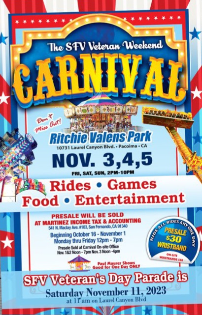 A carnival will be held on Friday, Nov 3rd, 5:00 p.m.-10:00 p.m., Saturday, Nov 4th, 2:00 p.m.-10:00 p.m. & Sunday, Nov 5th, 2:00 p.m.-10:00 p.m. at the baseball fields at the Ritchie Valens Recreation Center, 10736 Laurel Canyon Blvd.