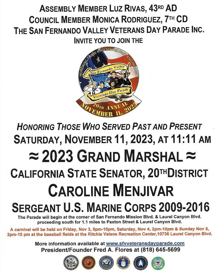 The 20th Annual San Fernando Valley Veterans Day Parade will take place on Saturday, November 11, 2023, at 11:11am.