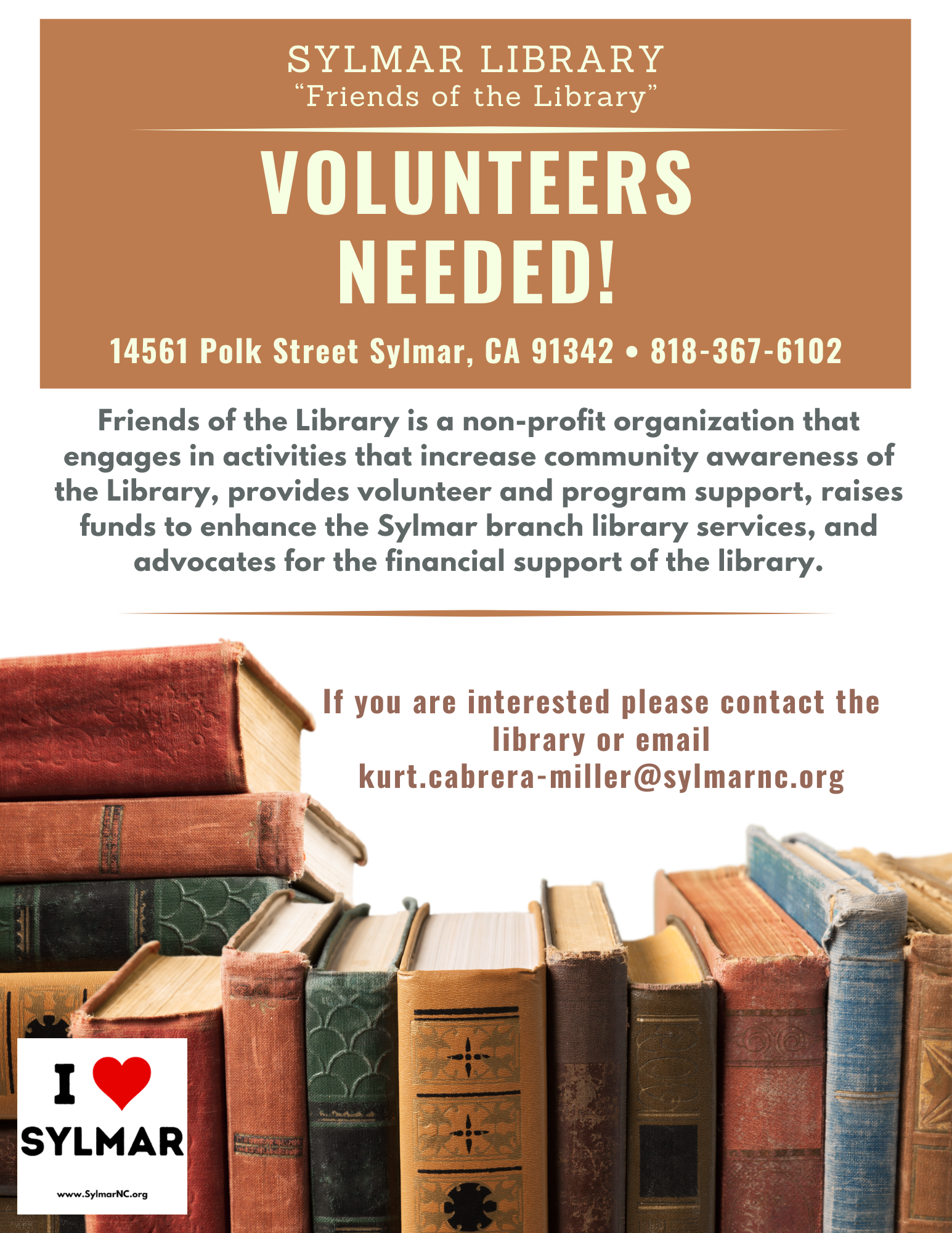 Friends of the Library is a non-profit organization that engages in activities that increase community awareness of the Library, provides volunteer and program support, raises funds to enhance the Sylmar branch library services, and advocates for the financial support of the library.