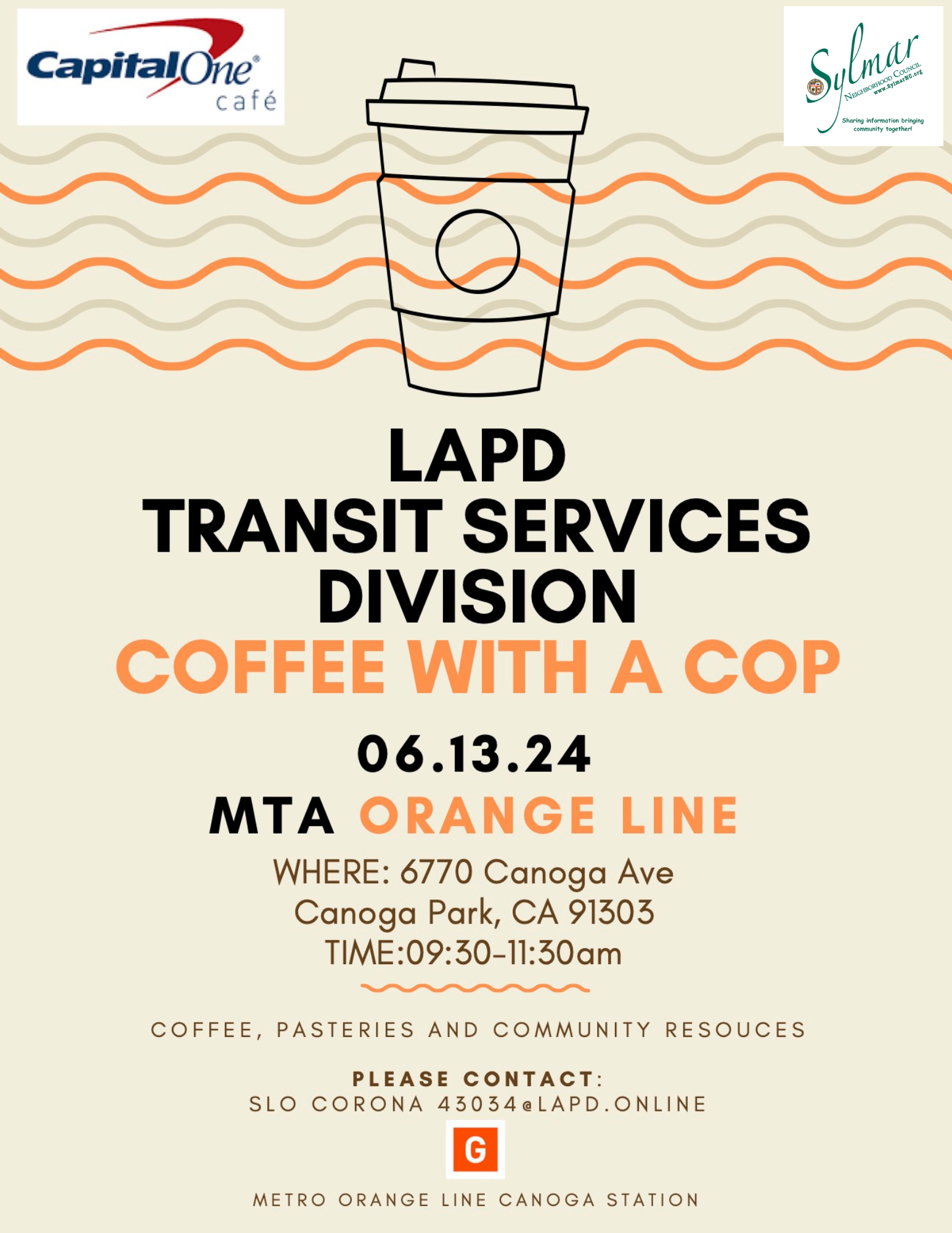 LAPD Senior Lead Officer Corona with LAPD Transit Services Division (TSD). LAPD Topanga Division, Senior Lead Officer Dinse, and TSD SLOs have coordinated a date and time to host a "Coffee With a Cop" event at MTA Canoga Station (Orange Line). They have partnered with Capital One Café which will be providing coffee, pastries, and banking information to all patrons utilizing the MTA system.