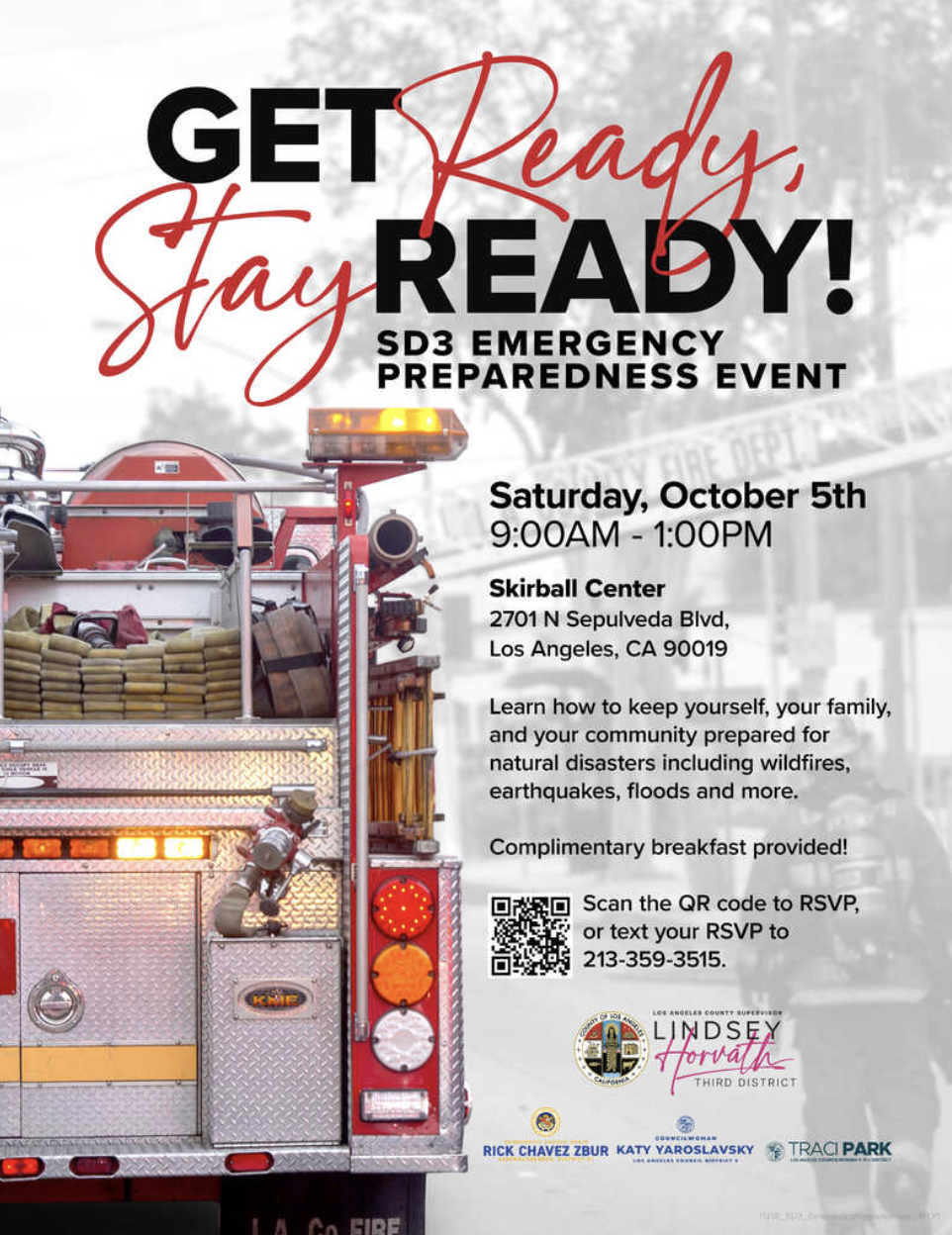 We are excited to invite you to "Get Ready, Stay Ready!" Emergency Preparedness Event on October 5th at the Skirball Center. This is a fantastic opportunity for you and your family to learn vital information about emergency preparedness and ensure you're ready for any situation.